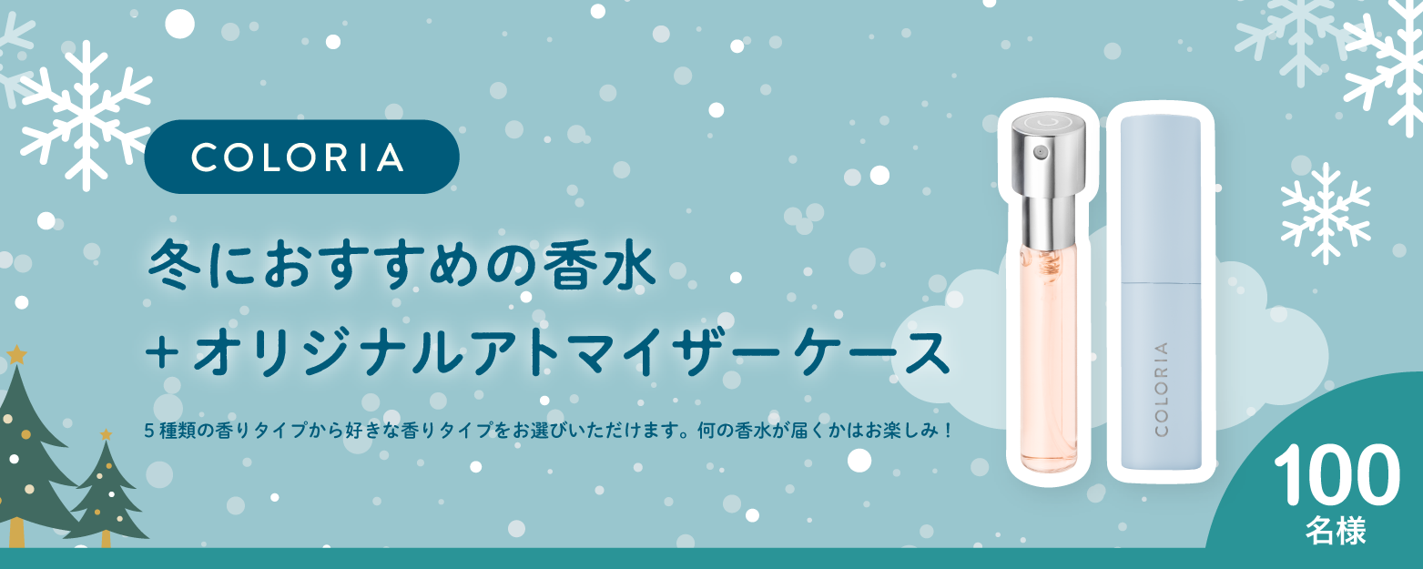 ※香水は冬におすすめの香りタイプ5種類(ムスク、ウッディ、オリエンタル、グルマン、パウダリー)から選んだ香りタイプのうち、カラリアがセレクトした香水アトマイザーが届きます。