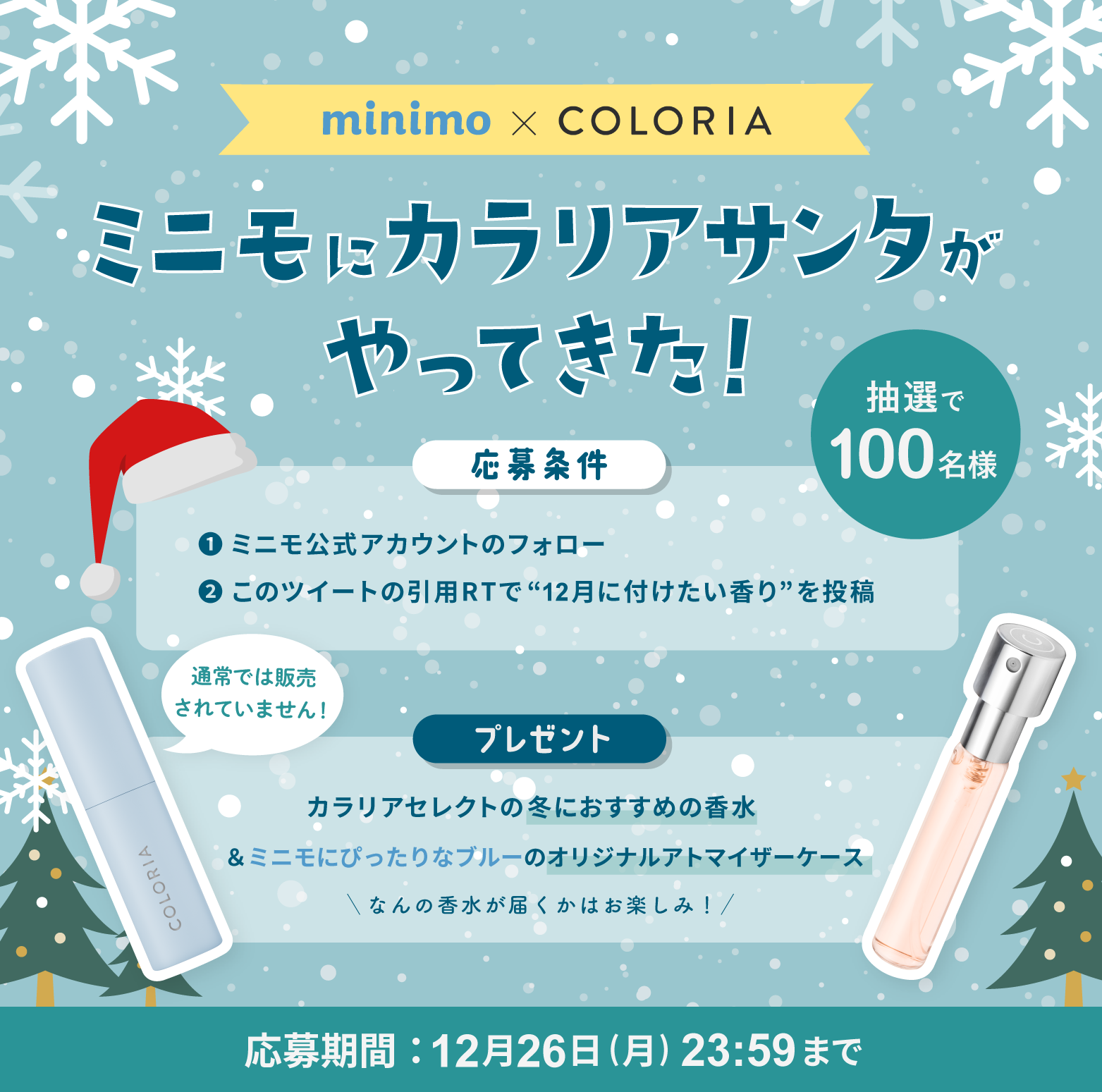 「Happy Xmas キャンペーン」は、アプリをダウンロードしている方なら誰でも応募可能なキャンペーンです。アプリ内のキャンペーンページから必要事項を入力して送信いただいた方の中から、抽選で「香りの総合プラットフォーム『カラリア』がセレクトした香水アトマイザーとミニモをイメージした限定色アトマイザーケースのセット」や「ブラシアイロン Twin」を合計120名様にプレゼントします。