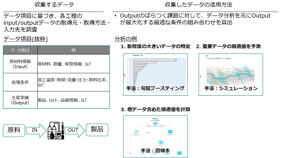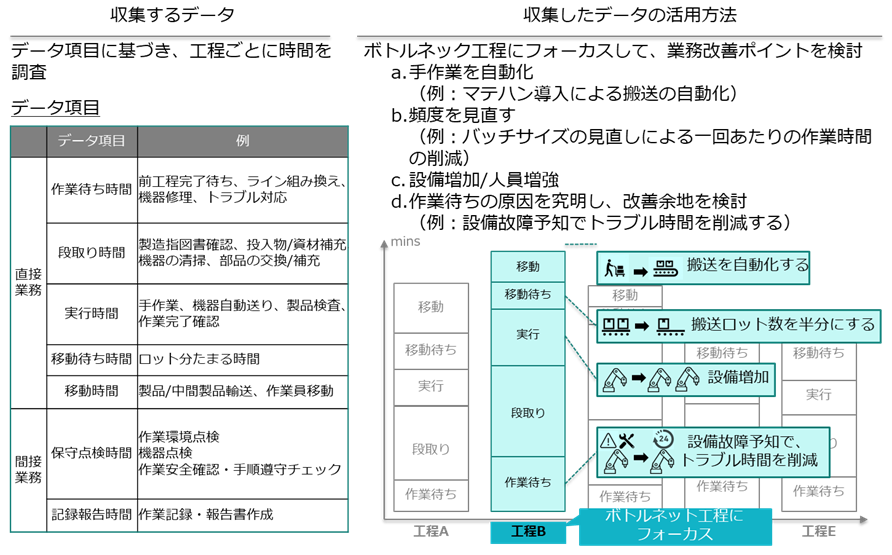 例3 省人化各工程のinput/outputデータの取得元・取得方法・入力先を調査し、データ取得観点から効率化できる業務を明確化します。データ分析活用を視野に入れ、取得できていないデータは取得方法を検討します