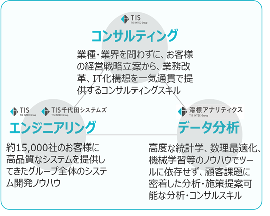 TISのコンサルティング力と、グループ会社であるTIS千代田システムズのシステム開発力と、澪標のデータ分析/AIの力を掛け合わせることで、従来のデータコンサルティングにはない「上流から下流まで一気通貫での製造DX」を実現します。