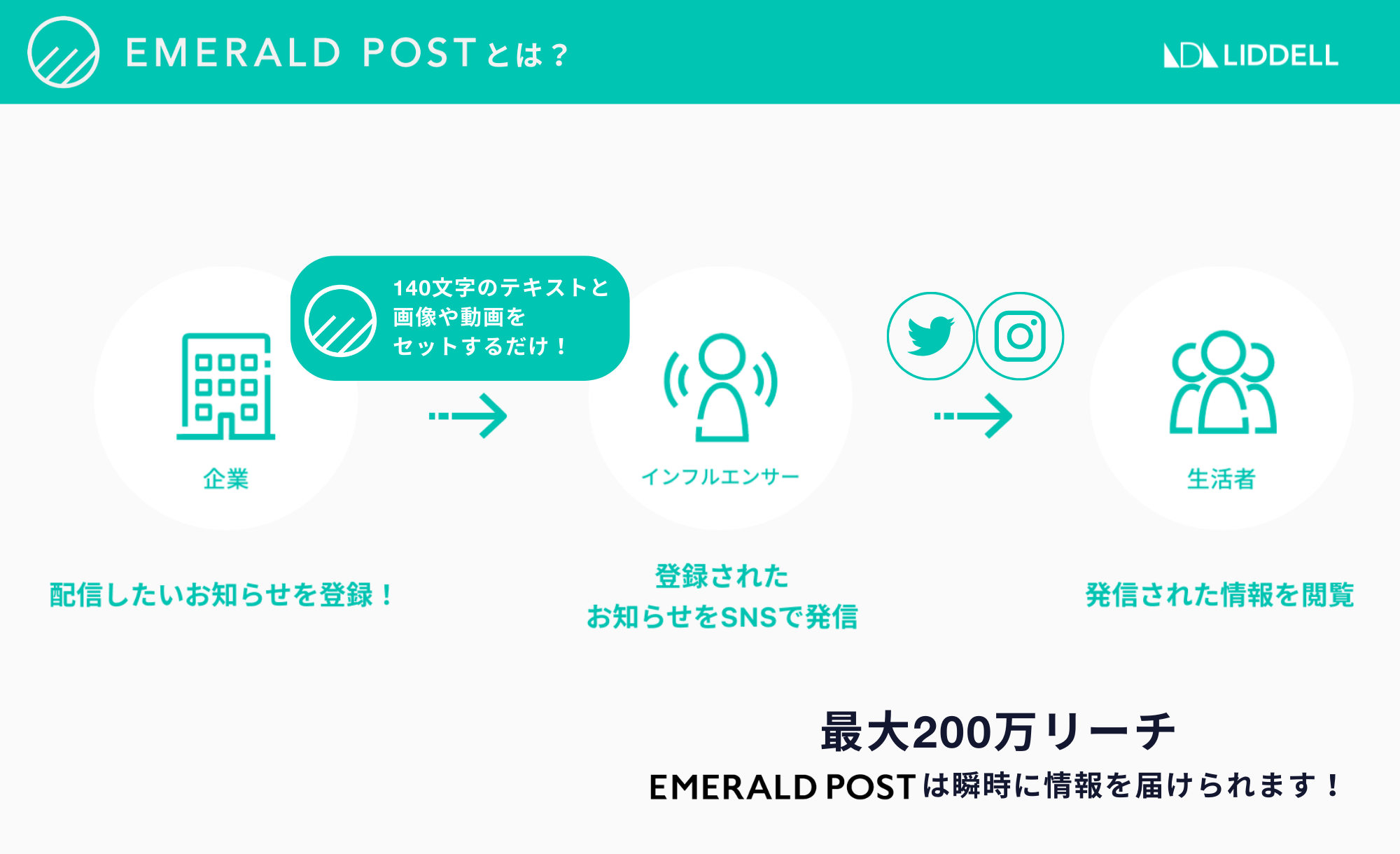『EMERALD POST(エメラルド ポスト)』は、お知らせしたい情報を、瞬時に人から人へ発信できるサービスです。インフルエンサーがSNS上で繋がっている、友人・知人・フォロワーに向けて情報を直接届けます。