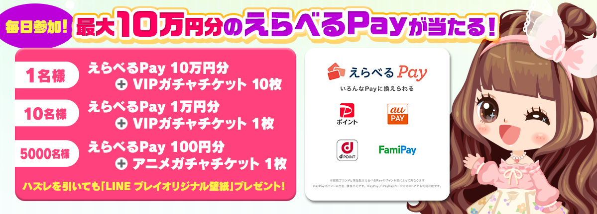 - 合計5,101名様に最大10万円分のえらべるPayやVIPガチャチケットが当たる”「LINE プレイ」10周年ありがとうTwitterキャンペーン”を実施!