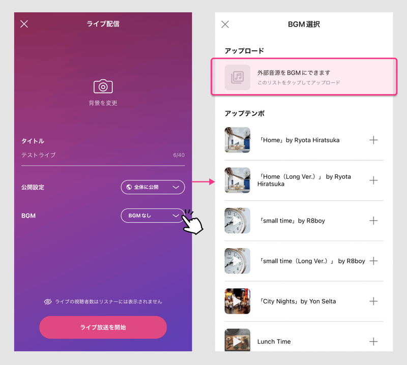 収録画面やライブ配信画面のBGM設定画面を開き、画面上部にある「外部音源をBGMにできます」というリストをタップして、音声ファイルのアップロードが最大10曲まで可能です。