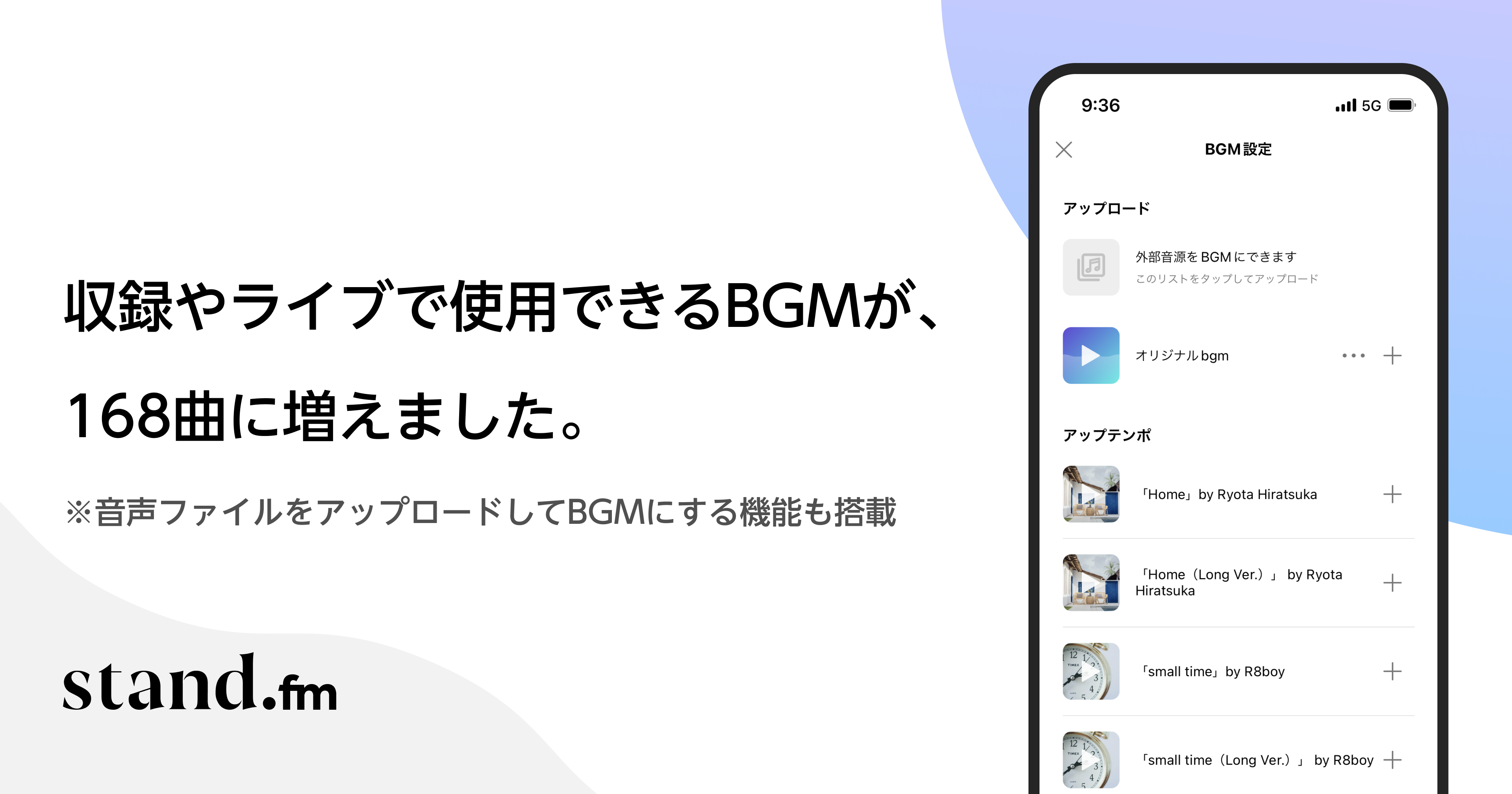 stand.fmでは、音声ファイルをBGMとしてアップロードできる機能を活用して、オリジナル楽曲や権利フリーの楽曲をBGMとして使用することもできます。