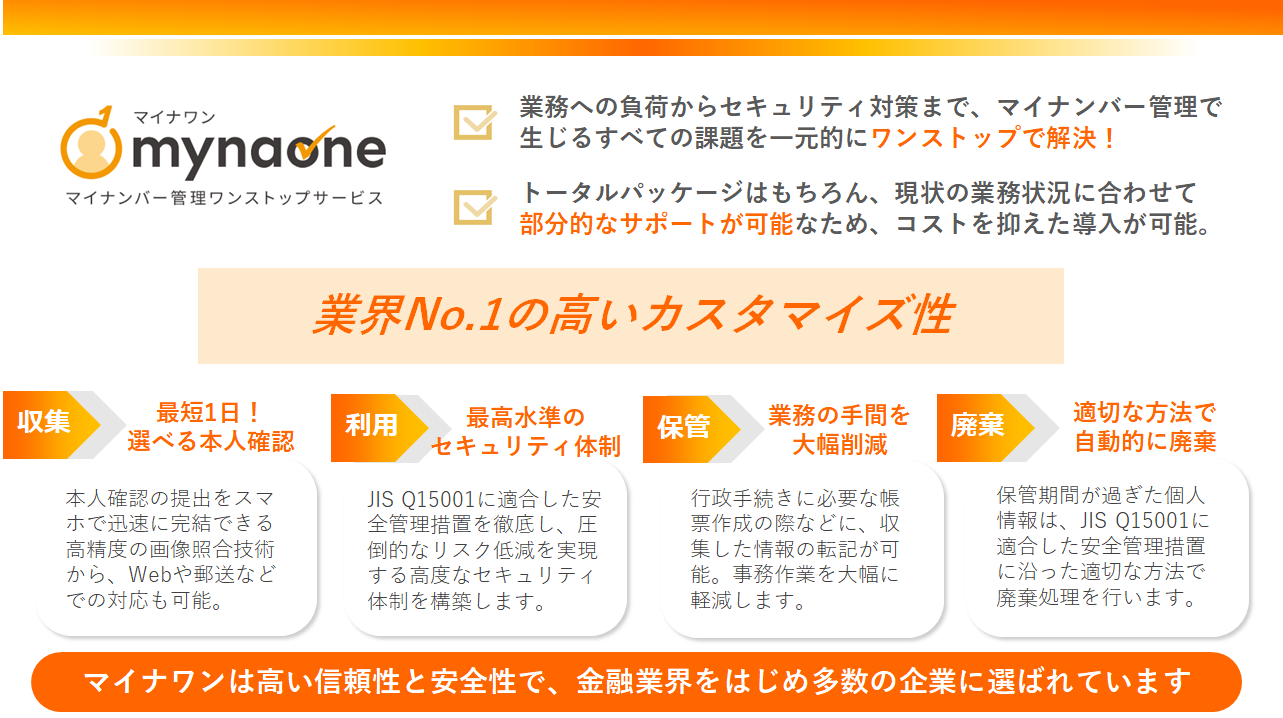『マイナワン』は、マイナンバーに関する業務をワンストップでサポートするサービスです。収集から登録・保管・削除・事務代行業務まで管理に必要な全ての業務をアウトソース可能なため、お客様のリスク低減と業務効率化を実現します。また、高いカスタマイズ性も特長の一つとして挙げられ、現行の管理フローやご要望に合わせて部分的なサービス提供も可能となっています。