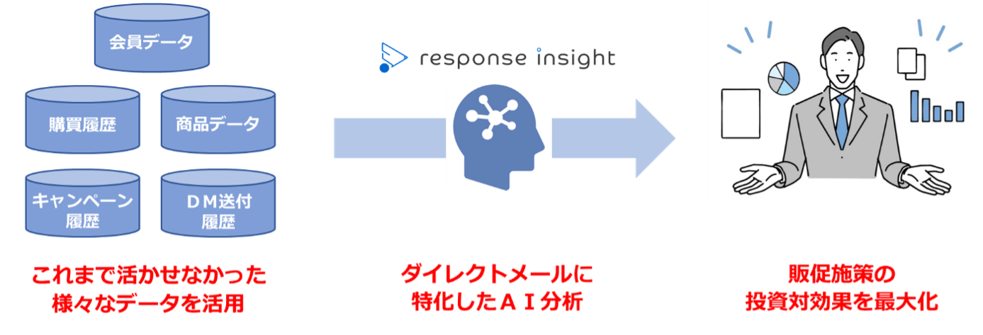 本サービスは、企業に蓄積されたさまざまなデータをもとに、顧客一人ひとりのDMの反応をAIが予測して送付先を自動選定するサービスです。属人化していた作業から解放されるとともに、眠っているデータの活用でDM施策の投資対効果を最大化します。