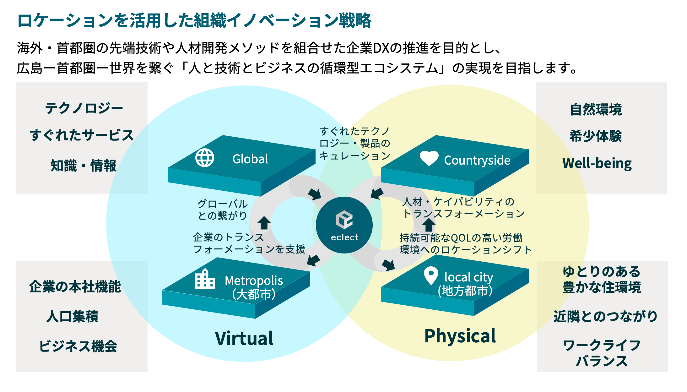 エクレクトは、このプロジェクトを通して、海外・首都圏の先端技術や人材開発メソッドを組合せた企業DXの推進を目的とし、広島ー首都圏ー世界を繋ぐ「人と技術とビジネスの循環型エコシステム」の実現を目指します。