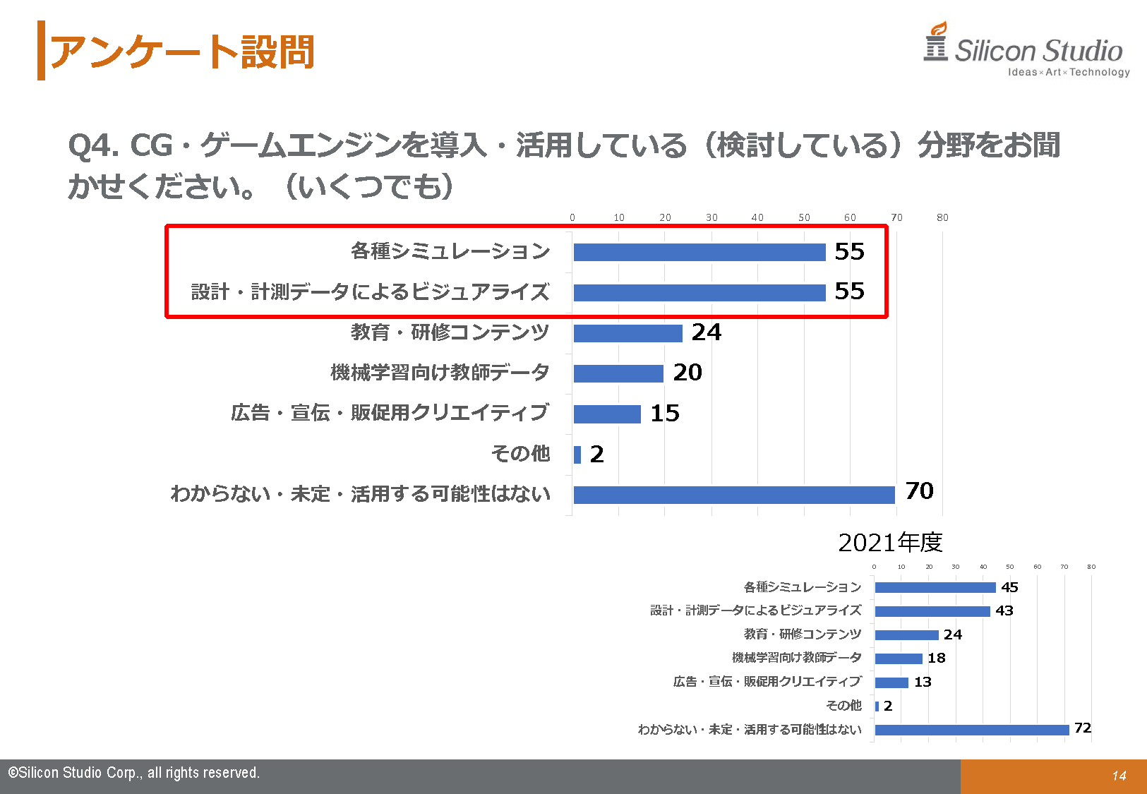 CG・ゲームエンジンの導入・活用分野は、「わからない・未定・活用する可能性はない」を除くと「各種シミュレーション」と「設計・計測データによるビジュアライズ」が最も多く、昨年の調査から7ポイント以上増加し、全回答者の約4割が活用している、または検討しているという結果となりました。この分野での注目度、認知度、効果への期待度の向上がうかがえます。