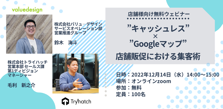 株式会社バリューデザイン(本社:東京都中央区、代表取締役社長:林 秀治、以下 バリューデザイン)は、株式会社トライハッチと共催で、飲食店向けWebセミナー「“キャッシュレス”דGoogleマップ”店舗販促における集客術」を2022年12月14日(水)14時~15時に開催いたします。