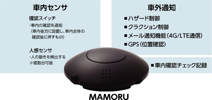 HKS 送迎バス安心見守り装置サービス MAMORU(仮名)は、送迎終了時に『車内最後部に設置したスイッチを押す』ひと手間で、人による目視確認と車内に設置した人感センサの両方にて所在確認を行ない、置き去りを防止する装置です。