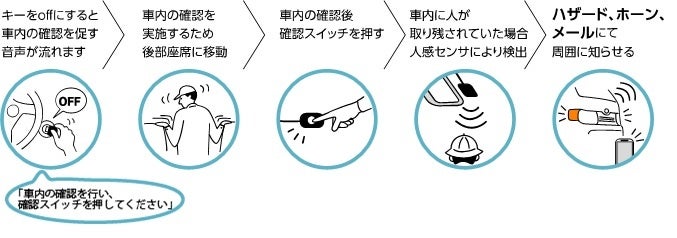 目視確認後、確認スイッチを押すと人感センサが作動します。施錠後(ドアが閉まる)に万が一、人が残っていた場合はセンサが検知し、クラクションがなるとともにハザードランプが点滅し、周囲にお知らせします。