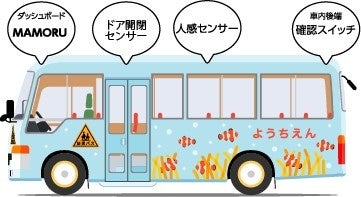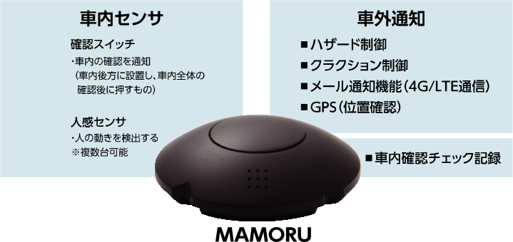 HKS 送迎バス安心見守り装置サービス MAMORU(仮名)は、送迎終了時に『車内最後部に設置したスイッチを押す』ひと手間で、人による目視確認と車内に設置した人感センサの両方にて所在確認を行ない、置き去りを防止する装置です。
