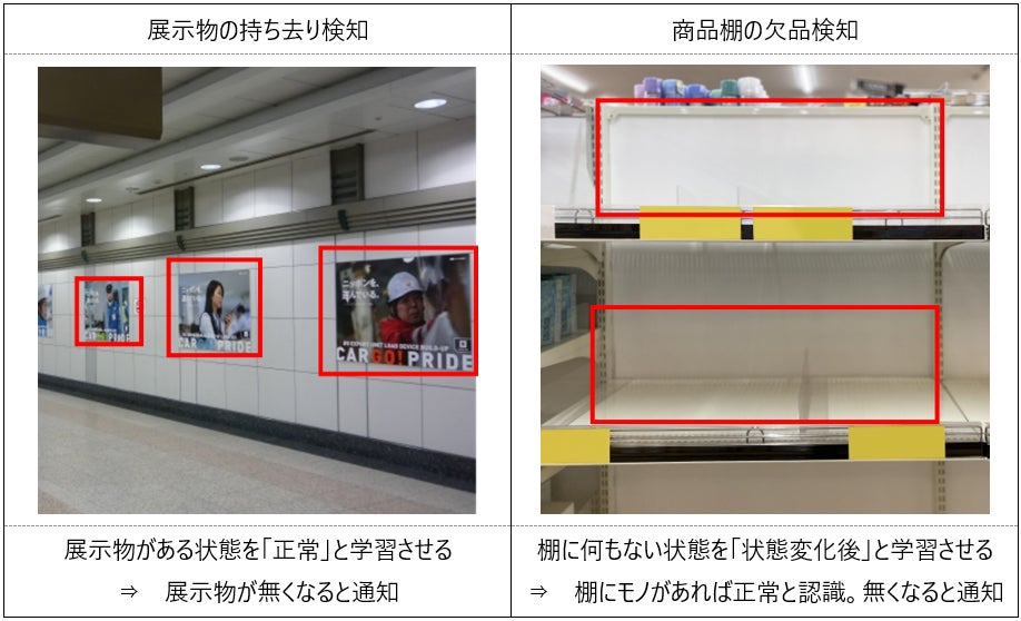 例えば、展示物の持ち去り検知、商品棚の欠品検知、扉の開放検知、車の停車検知など、変化を検知して素早い対応が必要となるシーンで活用いただけます。