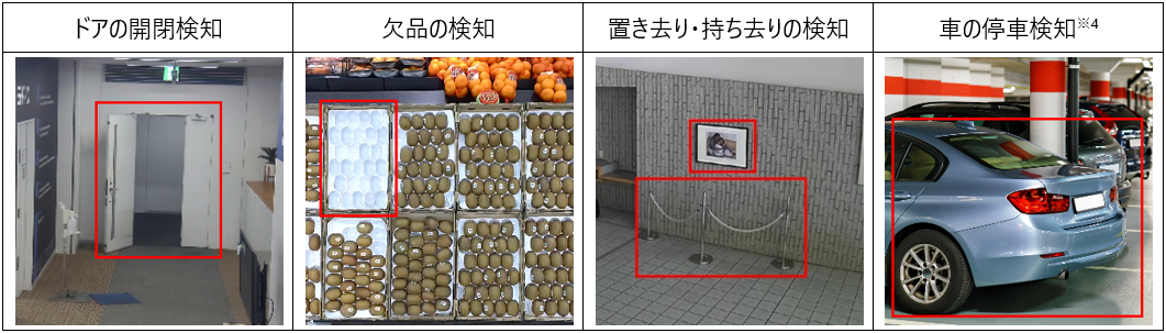 例えば、展示物の持ち去り検知、商品棚の欠品検知、扉の開放検知、車の停車検知など、変化を検知して素早い対応が必要となるシーンで活用いただけます。