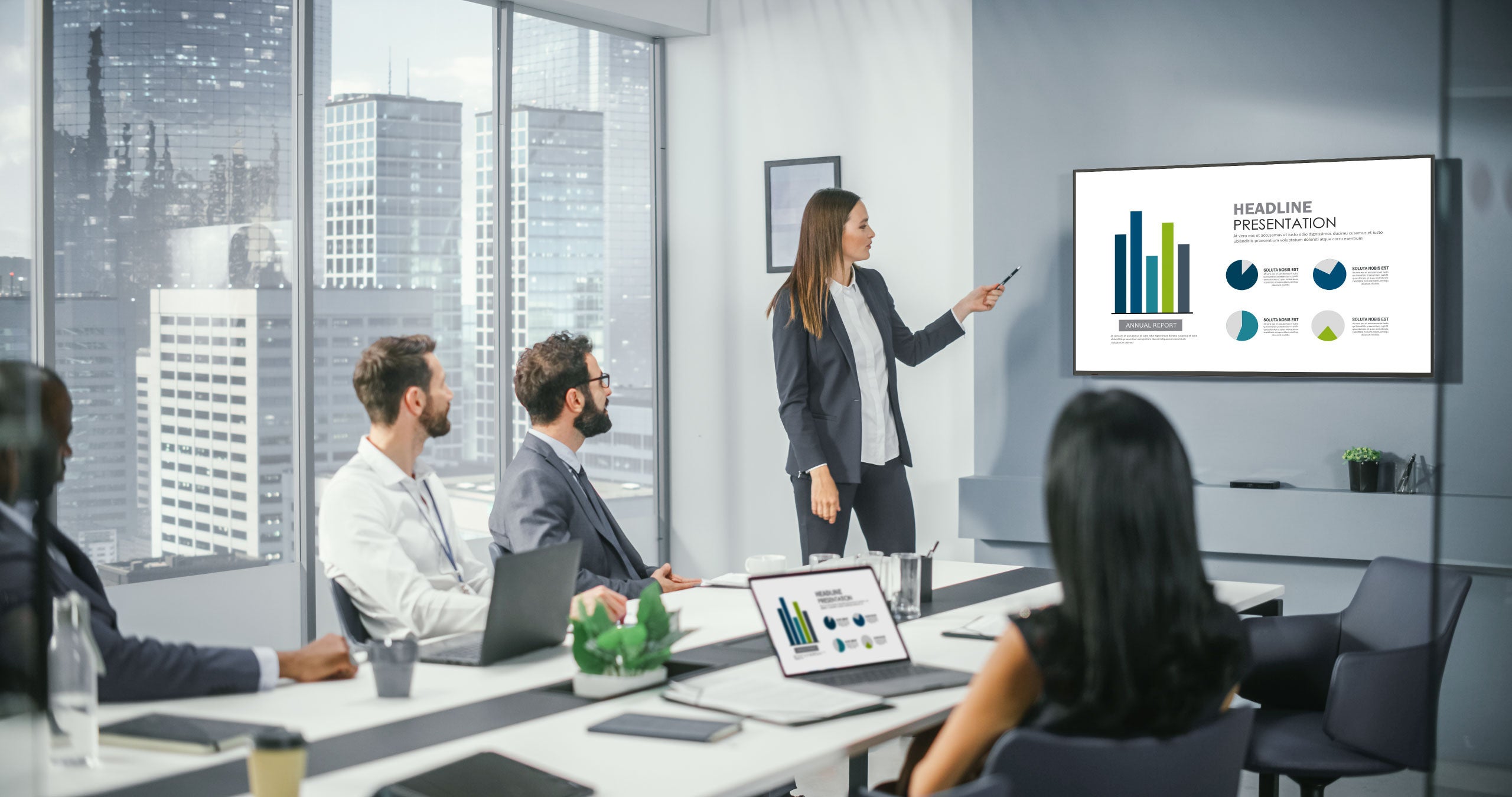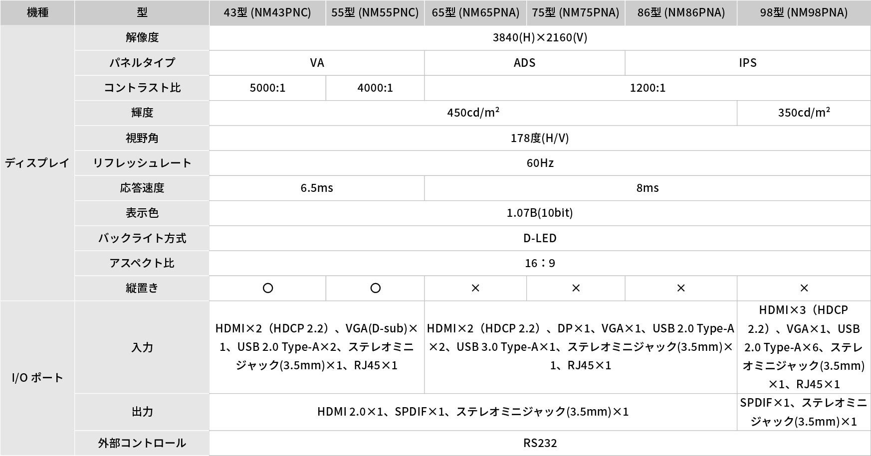 43型〜98型までの豊富なサイズで展開。スリムベゼルのシンプルなデザインで、細部まで鮮やかに再現する高解像度ディスプレイは広さを問わずあらゆるオフィスで活躍します。