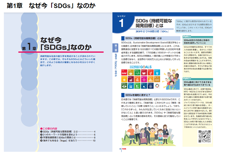第1章:SDGsの基本的な知識から実際の取り組みまで、SDGsの授業を始めたい先生方に向けて分かりやすく紹介しています。