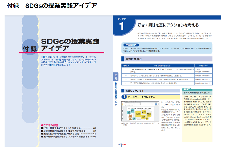 付録:Google for Education の多彩なツールと、金沢工業大学が開発したゲーミフィケーション教材「THE SDGs アクションカードゲーム X(クロス) 」を組み合わせたSDGsの授業実践のアイデアを、イメージを掴みやすいグラフィックとともにステップに沿って紹介しています。実践に必要なワークシートのテンプレートは、「master study」からコピーして使用することができます。