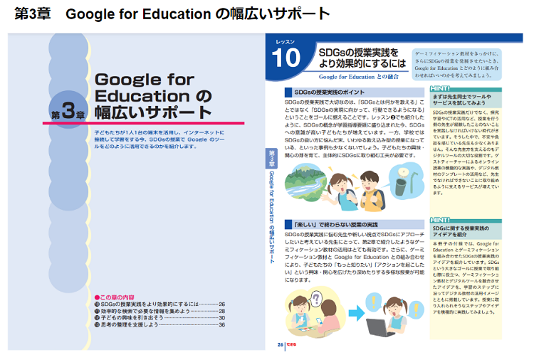 第3章:GIGAスクール構想の実現とSDGsのゴールとは密接につながり合っています。子どもたちの1人1台端末とクラウド環境を最大限に活かしたSDGs授業を可能にする Google for Education の活用例として、3つのツールを操作方法とともに紹介しています。