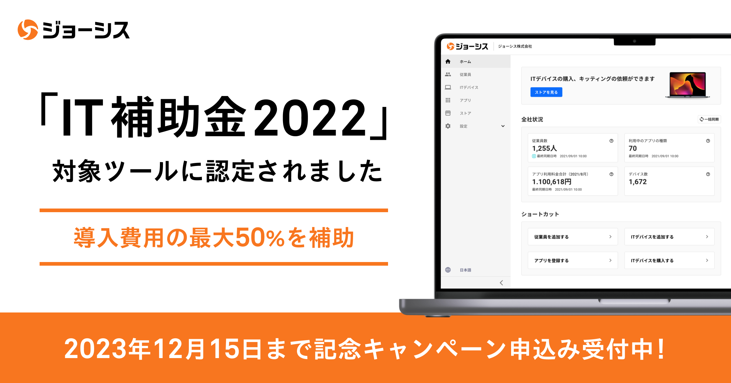 当社が提供するITデバイス&SaaSの統合管理クラウド「ジョーシス」は、情報システム部門の方々のアナログな業務を自動化して該当部門の生産性を上げ、企業全体のDX推進を後押しするサービスです。「IT導入補助金」の認定事業者となることによって、さらに多くの企業に導入いただき、日本全体の生産性向上やDX推進に寄与していくことを目指してまいります。