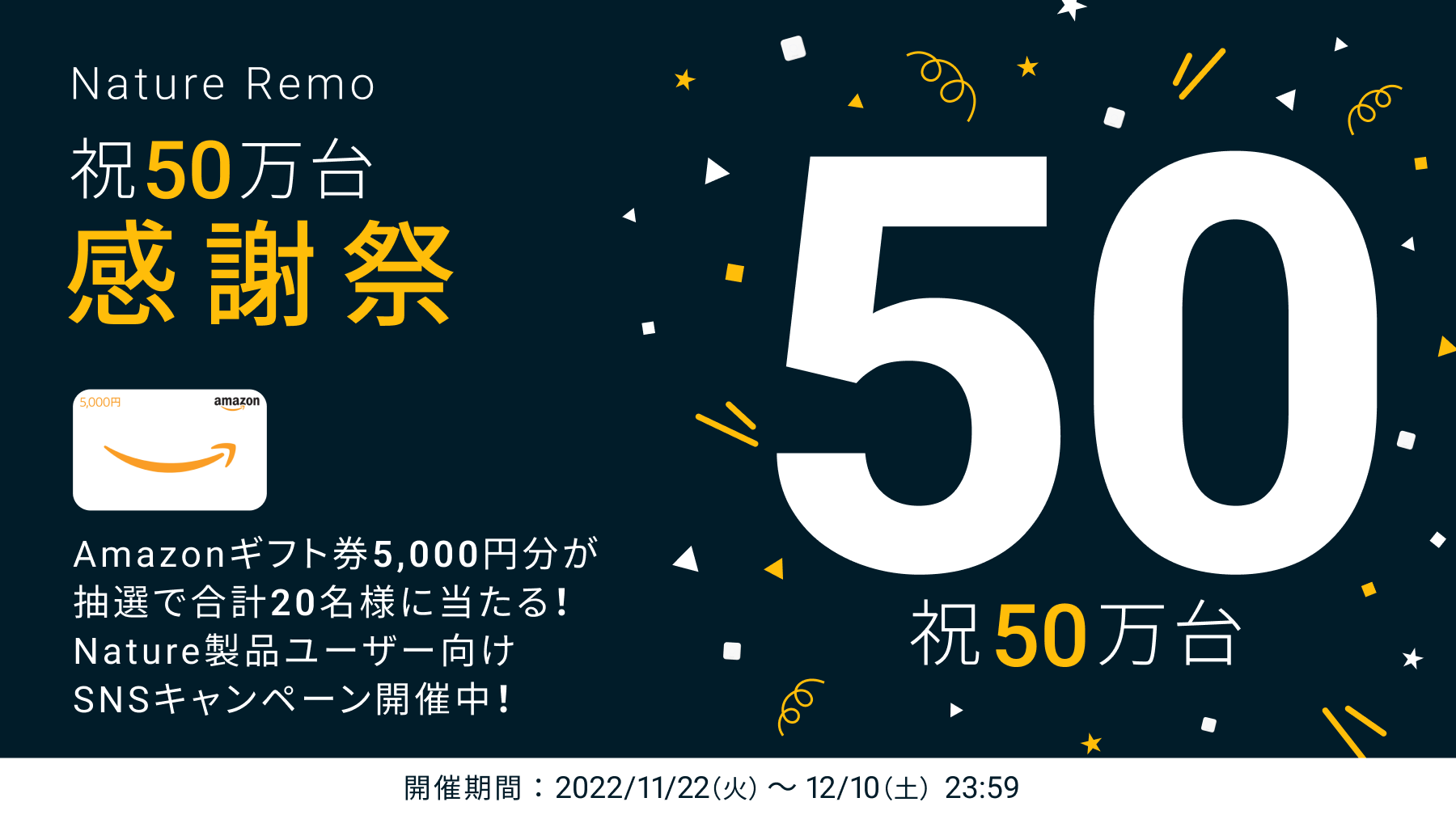 Natureはこれを記念し、50万台突破を支えていただいたユーザーのみなさまに感謝を届けるための「Nature Remo 祝50万台 感謝祭(以下:感謝祭)」を開催いたします。感謝祭は、Nature製品ユーザーを対象に実施。開催期間は2022年11月22日(火)〜2022年12月10日(土)23:59で、下記応募条件を達成された方の中から抽選で20名様にAmazonギフト券5000円分をプレゼントいたします。