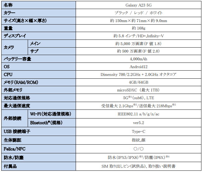 「Galaxy A23 5G」の特長は、以下のとおりです。