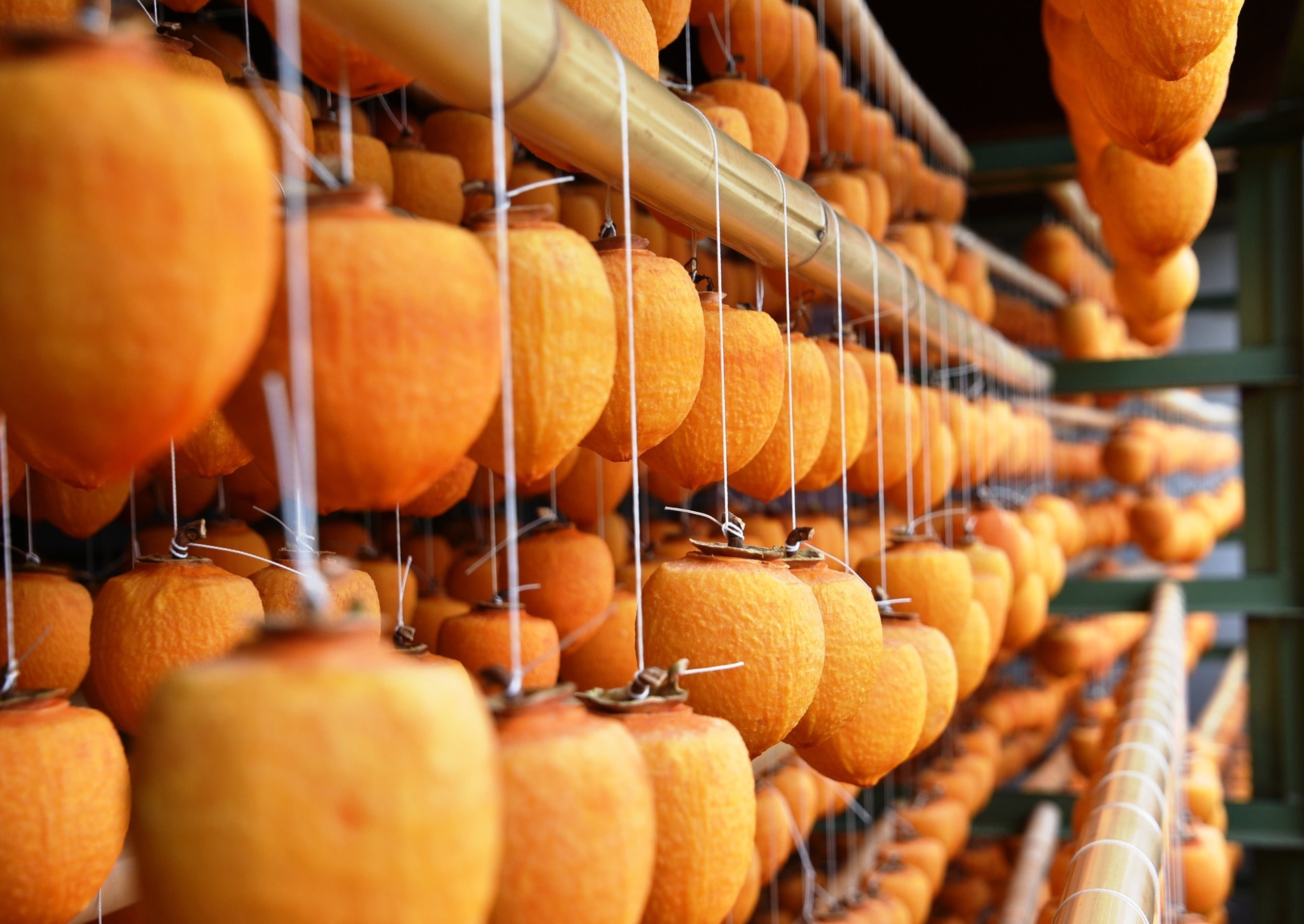 南砺市では古くから農家の冬仕事として干柿が生産されてきました。特に三社柿というこの地域でしか栽培されていない大きな渋柿を使った干柿作りが盛んです。