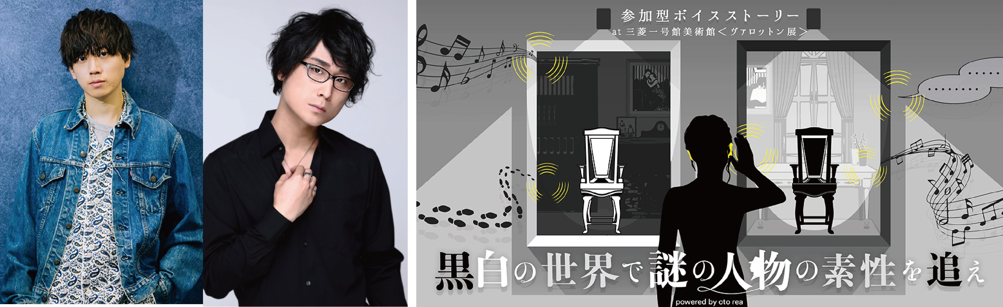 本コンテンツは、2022年10月29日(土)~ 2023年1月29日(日)の期間、三菱一号館美術館で開催中の展覧会「ヴァロットンー黒と白」内の企画の一つとして実施しており、ヴァロットン展の作品鑑賞をしながら、「謎の男」に導かれて、記憶を失った「青年」とともに素性の謎を解き明かす参加型のボイスストーリー・イベントです。イベント内で流れる音声は、「謎の男」に笠間淳さん、「記憶喪失の青年」には梶原岳人さんと、これまでも様々な話題作で活躍する声優のお二人を起用しており、作品の世界観とボイスストーリーが混ざり合った不思議な没入体験をもたらします。