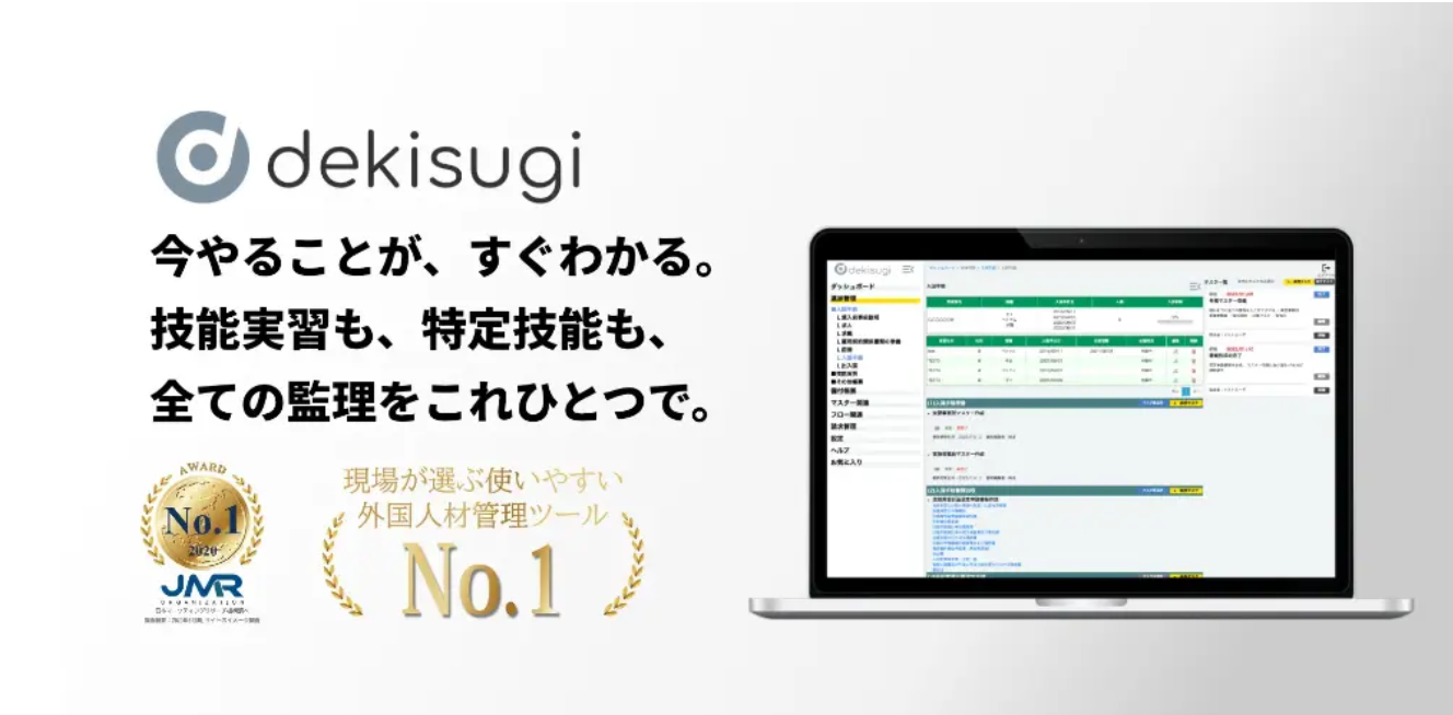 『dekisugi』(https://www.dekisugi-kun.jp/)はマスターへ情報を入力するだけで書類作成・データ管理・スケジュール管理などの一元管理が可能なクラウド型外国人材管理ツールです。