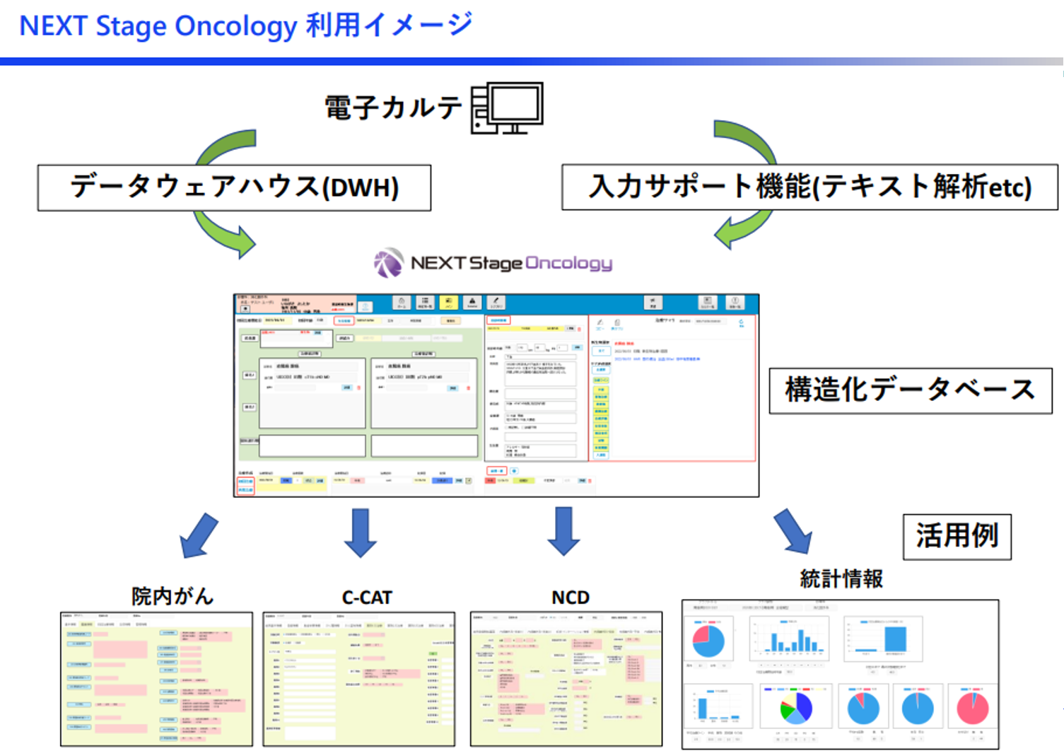 TXP Medical は、そのような診療科独自のデータベースを高度化した構造化汎用データベースであるNEXT Stage Oncology を2022 年4 月より提供しています。複雑なデータベースはややもすると入力が困難になりがちですが、構造化サポート機能やデータウェアハウス(DWH)と連携することで、ユーザーの視点に立った入力支援機能に重きをおいております。