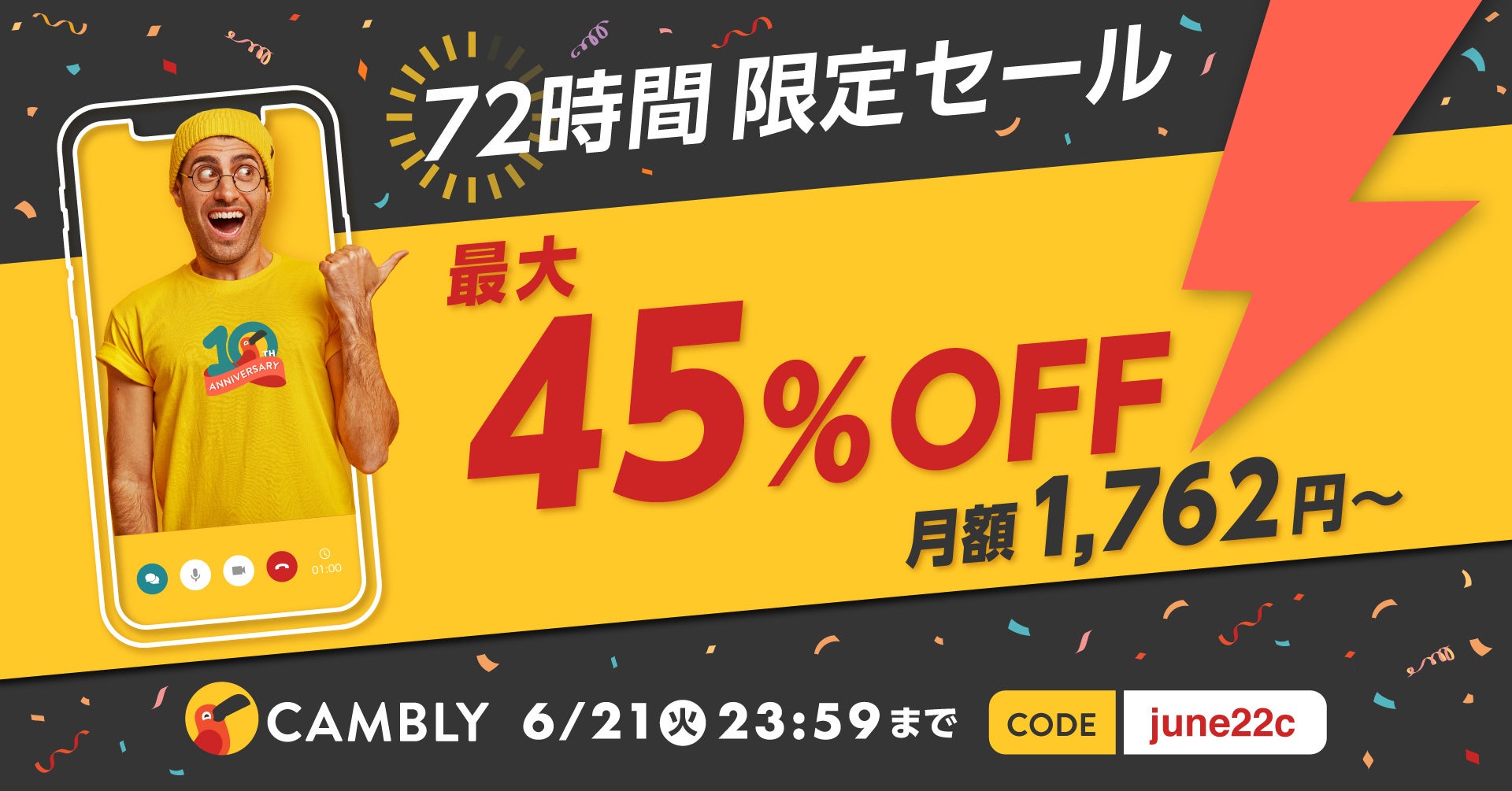 そんなCamblyのオンライン英会話レッスンが、6月19日(日)から6月21日(火)23時59分までの72時間限定で、最大45%OFFと大変お得にご利用いただけます。この機会にぜひCamblyをお試しください!