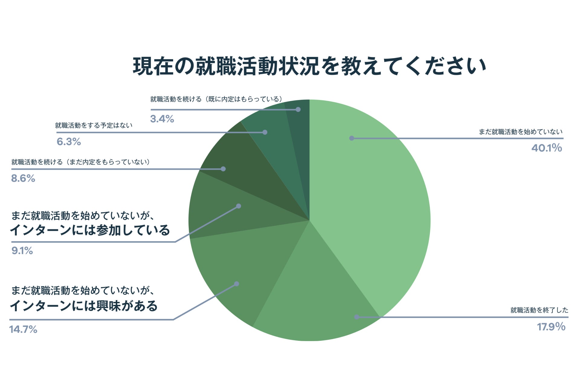 現在の就職活動の状況は、全体で見ると「就職活動を終了した(17.9%)」「まだ就職活動を始めていないが、インターンには興味がある(14.7%)」、「まだ就職活動を始めていないが、インターンには参加している(9.1%)」という結果となった。「インターンシップに参加もしくは興味がある」と回答した学生のうち、1年生は「21.0%」、2年生は「26.3%」という結果に。1・2年生の約4人に1人が「インターンシップに参加もしくは興味がある」と回答し、1・2年生の1.78%が「就職活動を続ける(既に内定はもらっている)」と回答していることから、本格的に就職活動が開始する大学3年生より以前から就職を意識して学生生活を送っている様子が見られた。