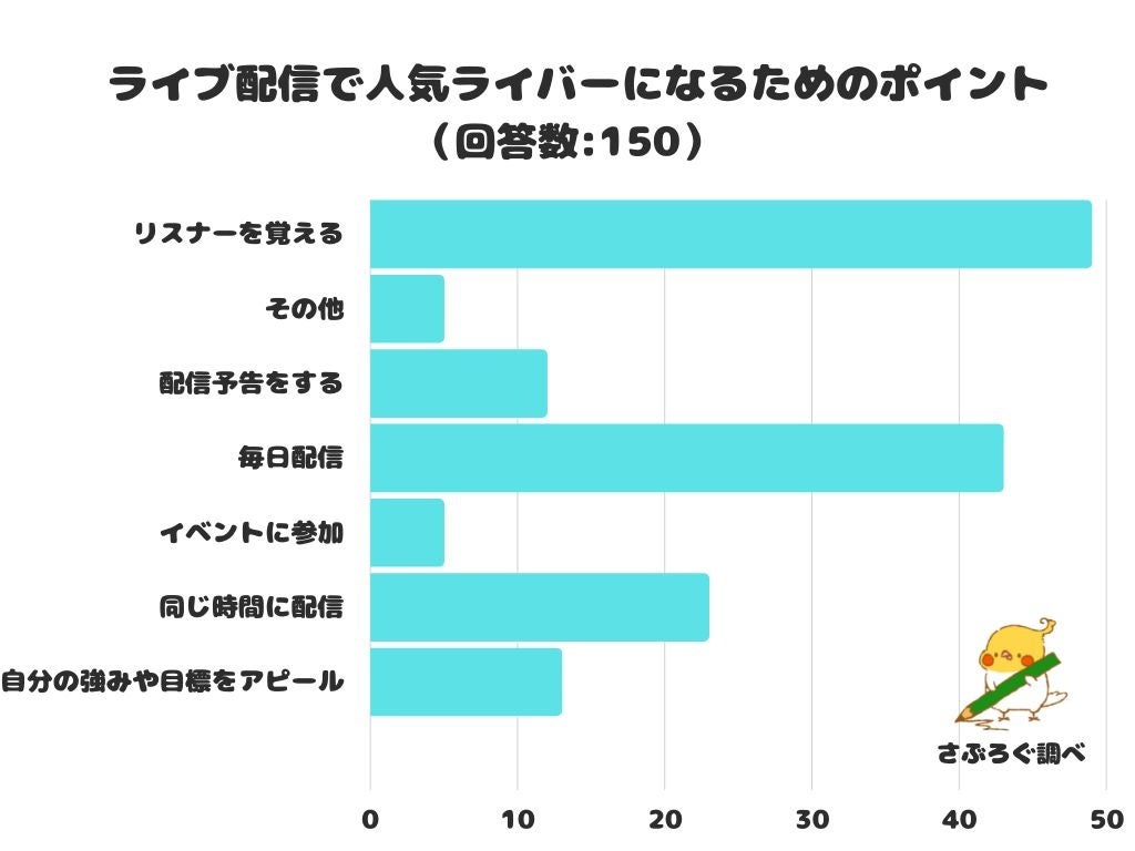 ライブ配信で人気ライバーになるためのポイントをアンケートにて調査したところ、1位は「リスナーを覚える」でした。