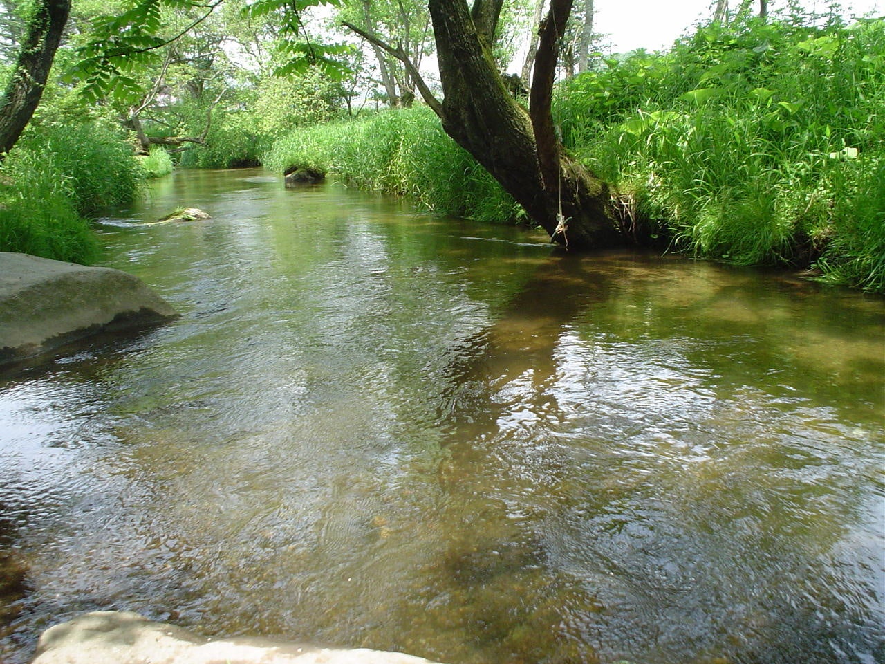 澄んだ水がさらさらと流れるカッパ淵は、うっそうとした茂みに覆われており、今にもカッパが現れそうな雰囲気。