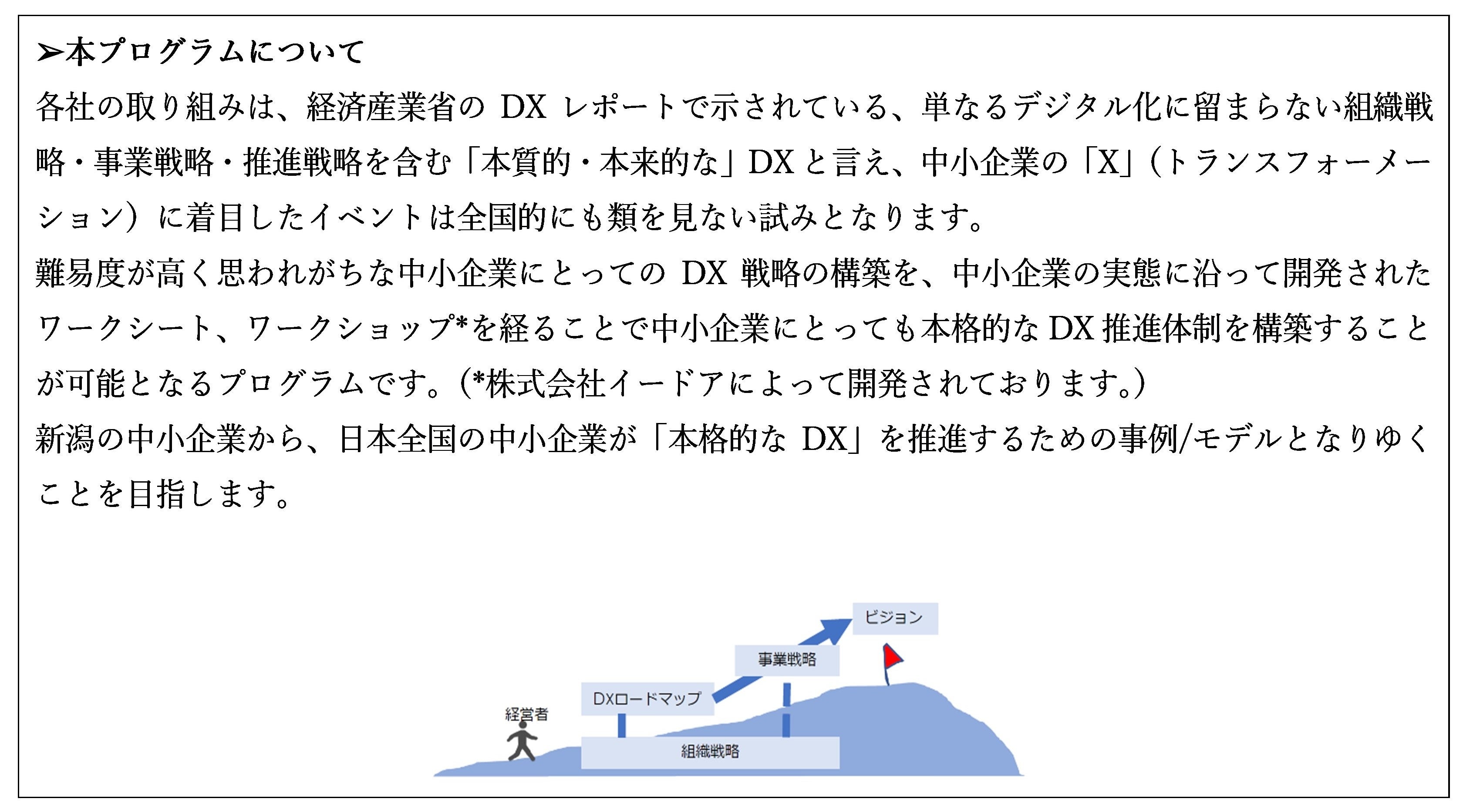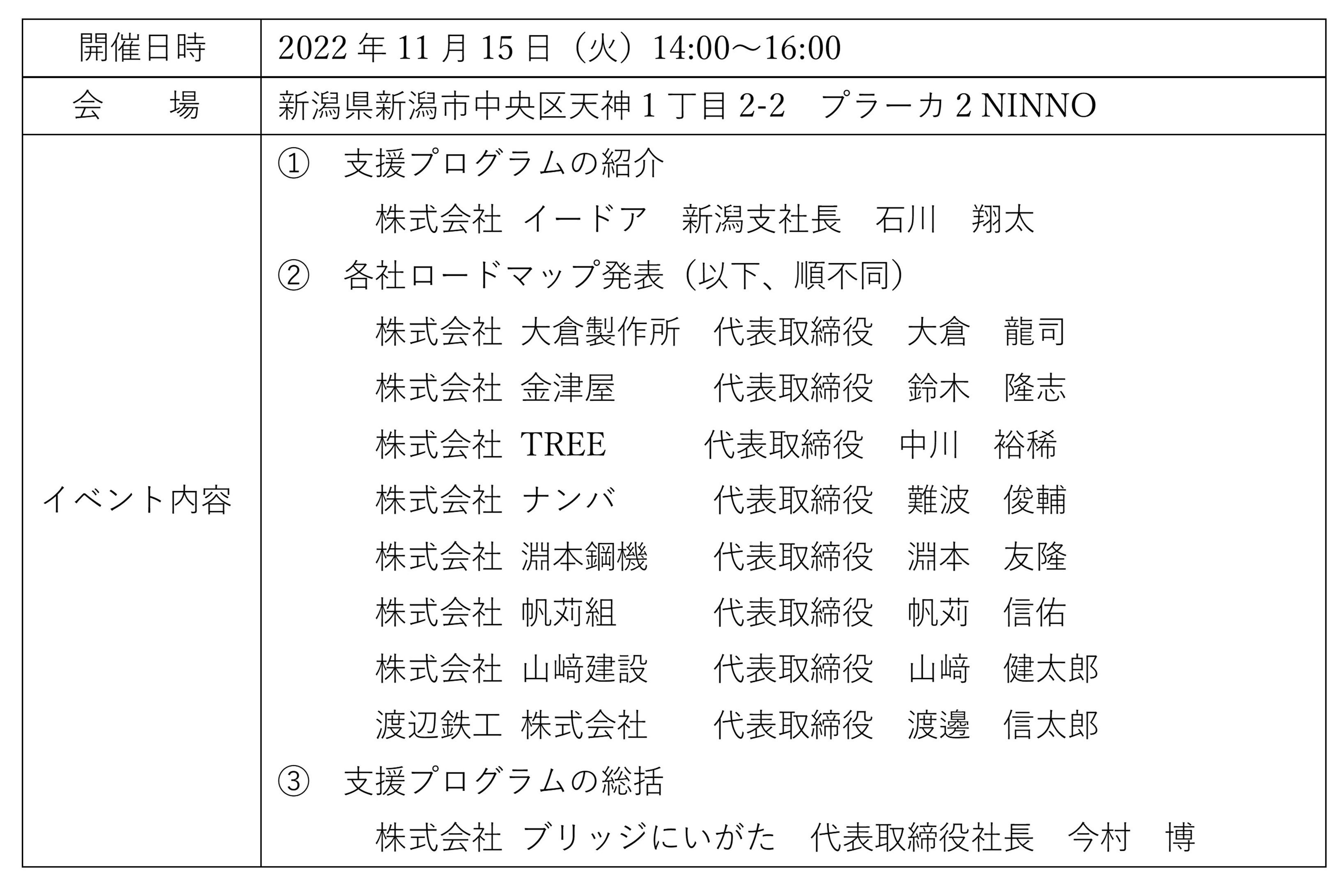 最終回となる本イベントでは、県内の選出中小企業8社より、自社のビジョンを実現するための事業戦略/組織戦略を踏まえた「DXロードマップ」を社内外に向けて発表しました。当日は新潟県内の各自治体、行政機関、支援機関など総計60名が参加しロードマップピッチを視聴し、交流しました。