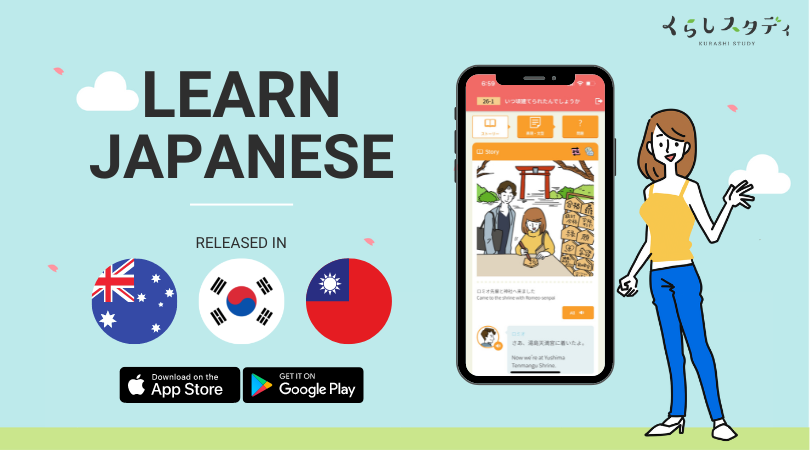 「くらしスタディ」は、全96話の会話シーンから日本語の文法や表現、単語、発音などを学ぶ日本語学習アプリです。現在は世界20カ国で販売され、累計19万ダウンロード(2022年9月時点)を突破しています。2022年最後のリリース国となったオーストラリアと韓国、台湾は日本語の学習者が多い事でも知られています。