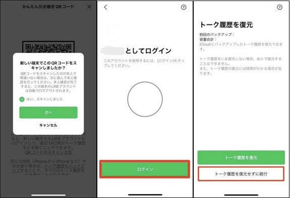 Step5: iPhoneに自分のアカウント情報が表示されますので、「ログイン」>「トーク履歴を復元せずに続行」>「OK」の順にタップすると、引き継ぎが完了します。