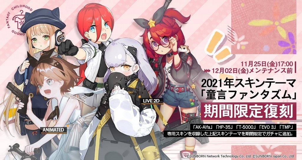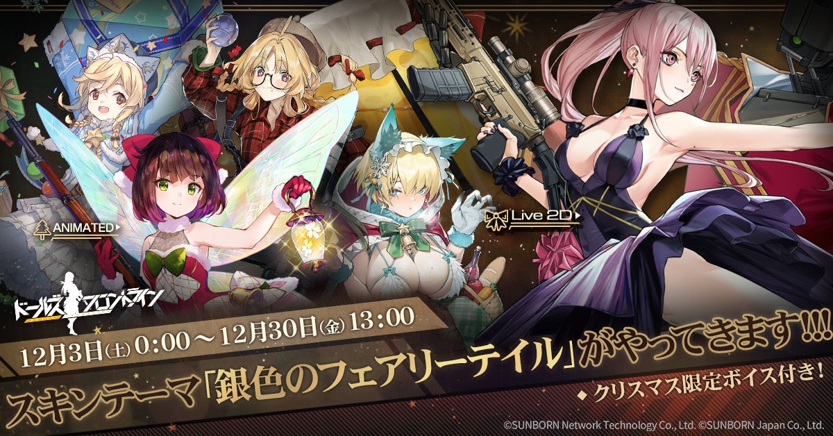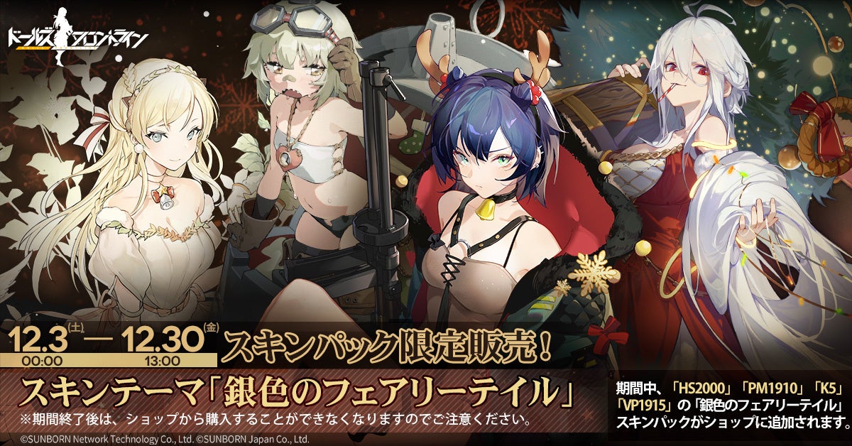 株式会社サンボーンジャパンは、スマホ向け戦略型シミュレーションゲーム『ドールズフロントライン(以下、「ドルフロ」)』において、12月3日(土)0時より追加されるクリスマスの妖精たちのような新スキン「銀色のフェアリーテイル」を先行して公開いたします。