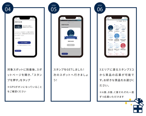 ヨルノヨ会場をはじめとする、横浜の夜を彩る全32か所のイルミネーションを巡りスタンプを集める企画です。集めたスタンプ数&エリアに応じて、横浜ならではの賞品を抽選でもらえます。任意の3エリア、スタンプ3コからご応募可能です。 スタンプはスマートフォンの「GPS」機能で獲得できる仕組みです。