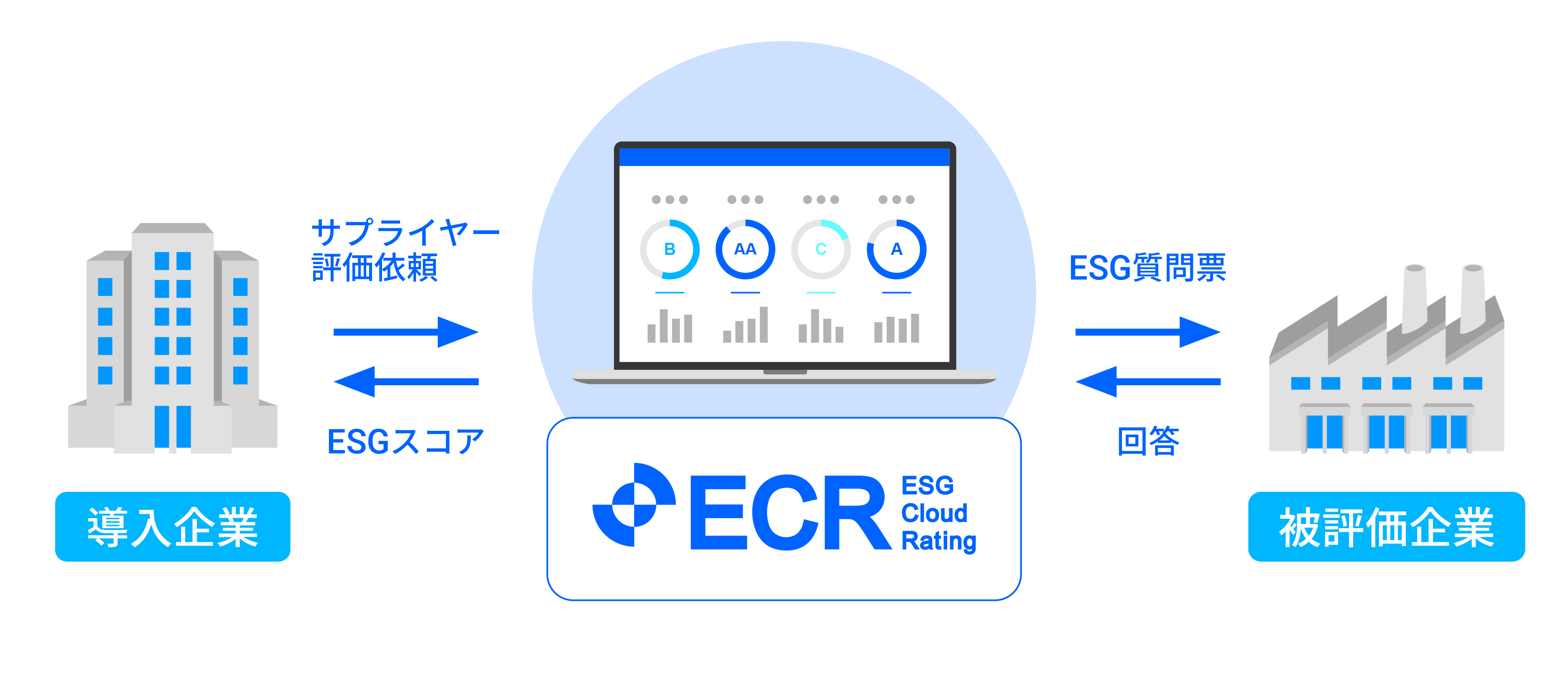 「ESGクラウドレーティング(ECR)」は、企業のサプライチェーンのESG(E:環境、S:社会、G:ガバナンス)経営の取り組みを可視化できるESG評価プラットフォームです。被評価企業がGRIなどのESGの国際基準・フレームワークに基づいた質問票に回答することで、導入企業(バイヤーなど)は、サプライチェーンのESG評価を「AAA〜CCC」の7段階のレーティングとスコアでカンタンに可視化できます。専門のESGアナリストが改善計画のレポート作成と提案を行い、取り組み改善・向上を促していきます。