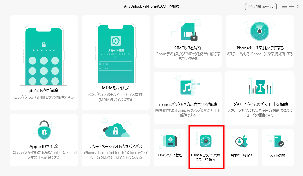 AnyUnlockは、iTunesバックアップのパスワードや画面ロックなどiPhoneの様々なロックを解除できます。