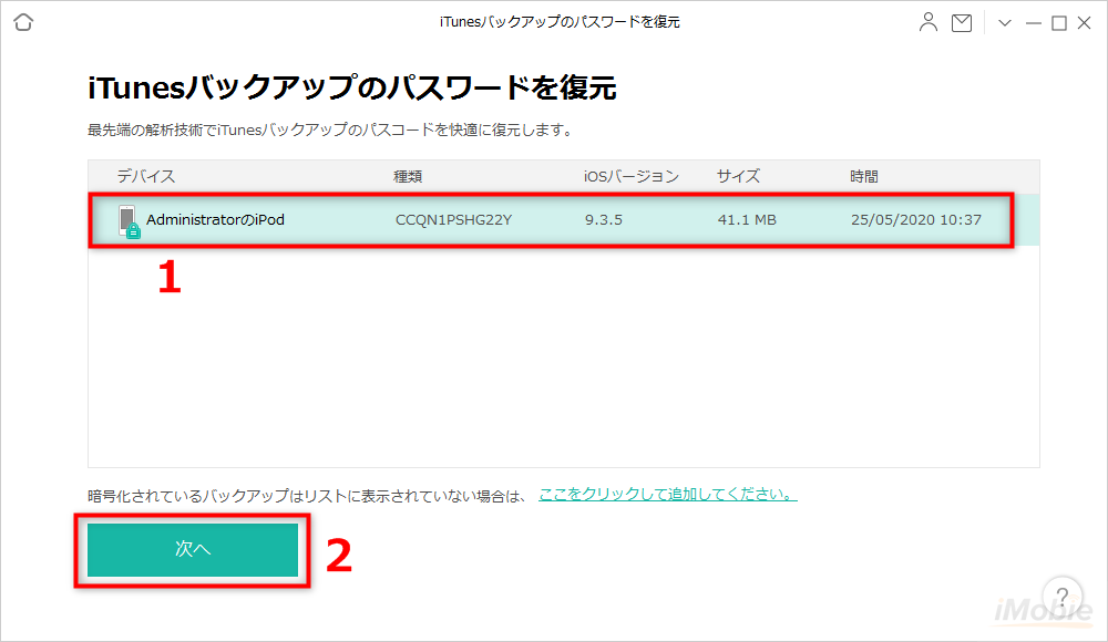Step 2.暗号化されたバクアップを一つ選択 > 「次へ」ボタンをクリックします。
