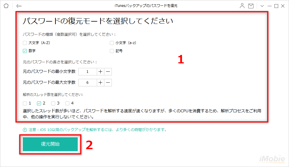 Step 3.パスワードの復元モードを選択 > 「復元開始」ボタンをクリックします。