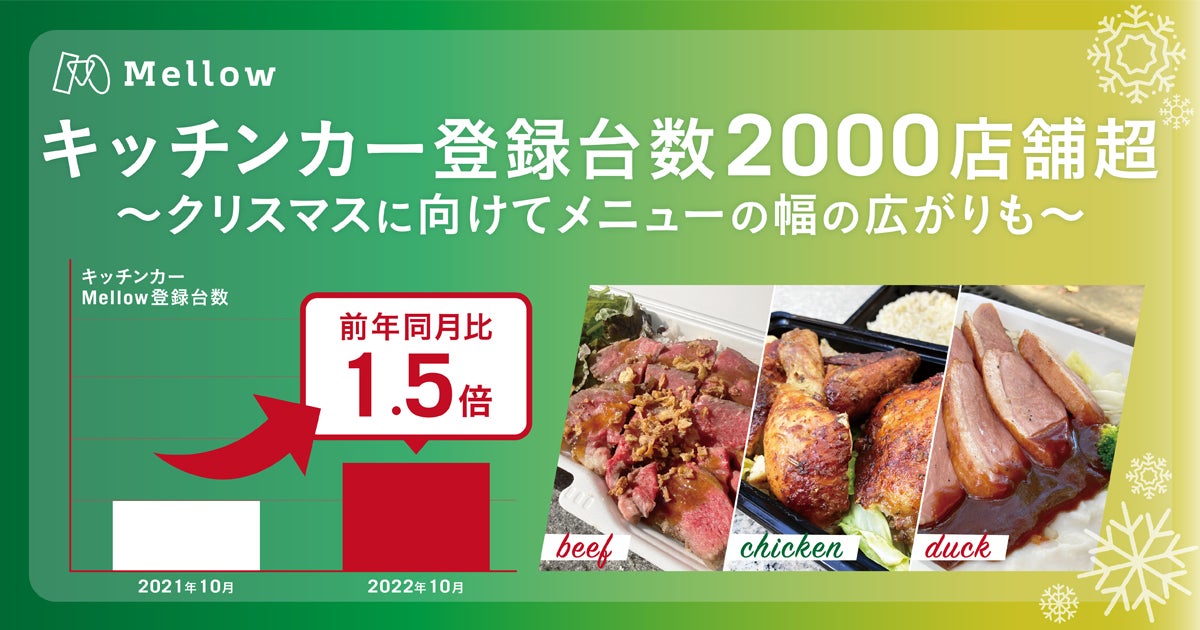 日本最大級のモビリティビジネス・プラットフォーム「SHOP STOP」を展開する株式会社Mellow (本社:東京都千代田区 代表:石澤 正芳、森口 拓也、以下「メロウ」)は、キッチンカーの登録台数が2000店舗を突破、前年同月10月対比で1.5倍となりましたことをお知らせします。また、2021年6月の食品衛生法の改正による参入障壁の低下も追い風に、増加傾向が続いており、より自由度が高く、本格的なメニューも増えています。