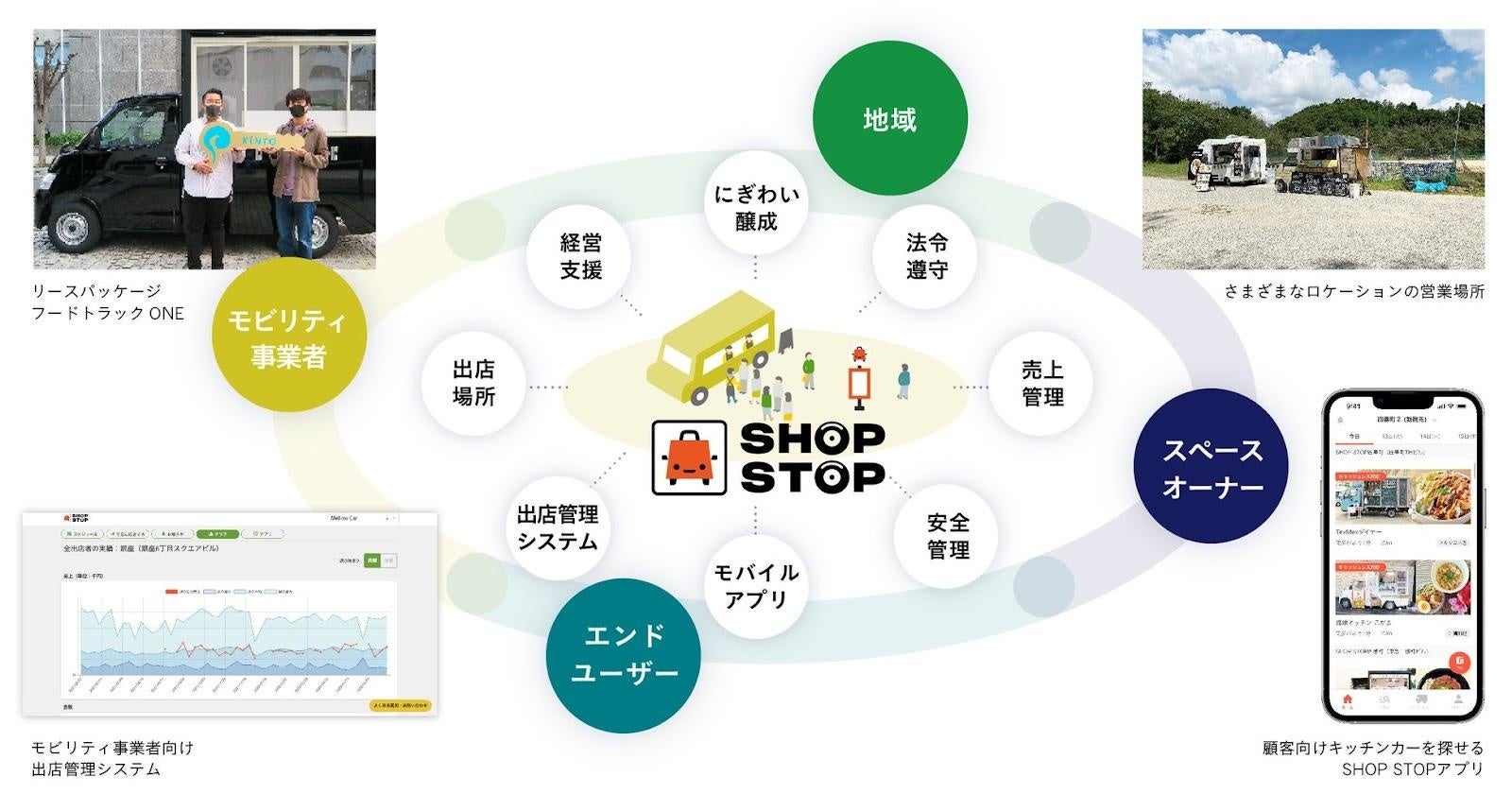 キッチンカーをはじめとした店舗型モビリティビジネス向けのプラットフォームです。現在、営業場所792カ所、登録店舗数2002店と日本最大規模となっており、全国20都道府県で営業を実施済み(実証実験含む)で、今後もエリア拡大を加速していきます。また、多種多様なキッチンカーを手軽に探すことができるSHOP STOPアプリでは、個店の情報として分散しがちなキッチンカーの情報を集約し、集客機会や顧客接点を創出しています。また、ハイブリッドワークに適した「勤務地・自宅登録機能」や、「気になるお店の通知機能」も搭載するなど、キッチンカー事業者、顧客双方の課題解決や、社会の変化に応じたアップデートを続けています。