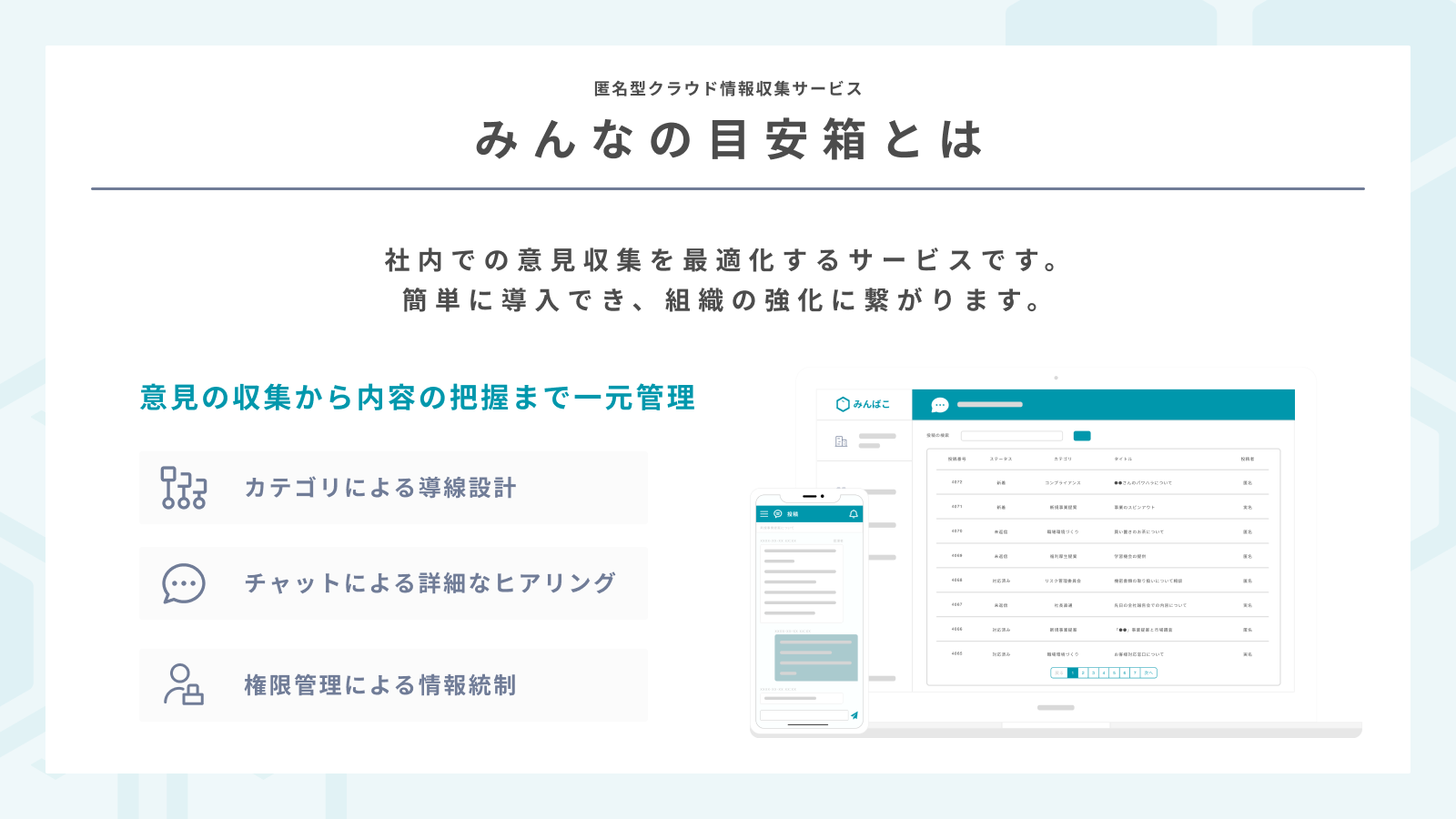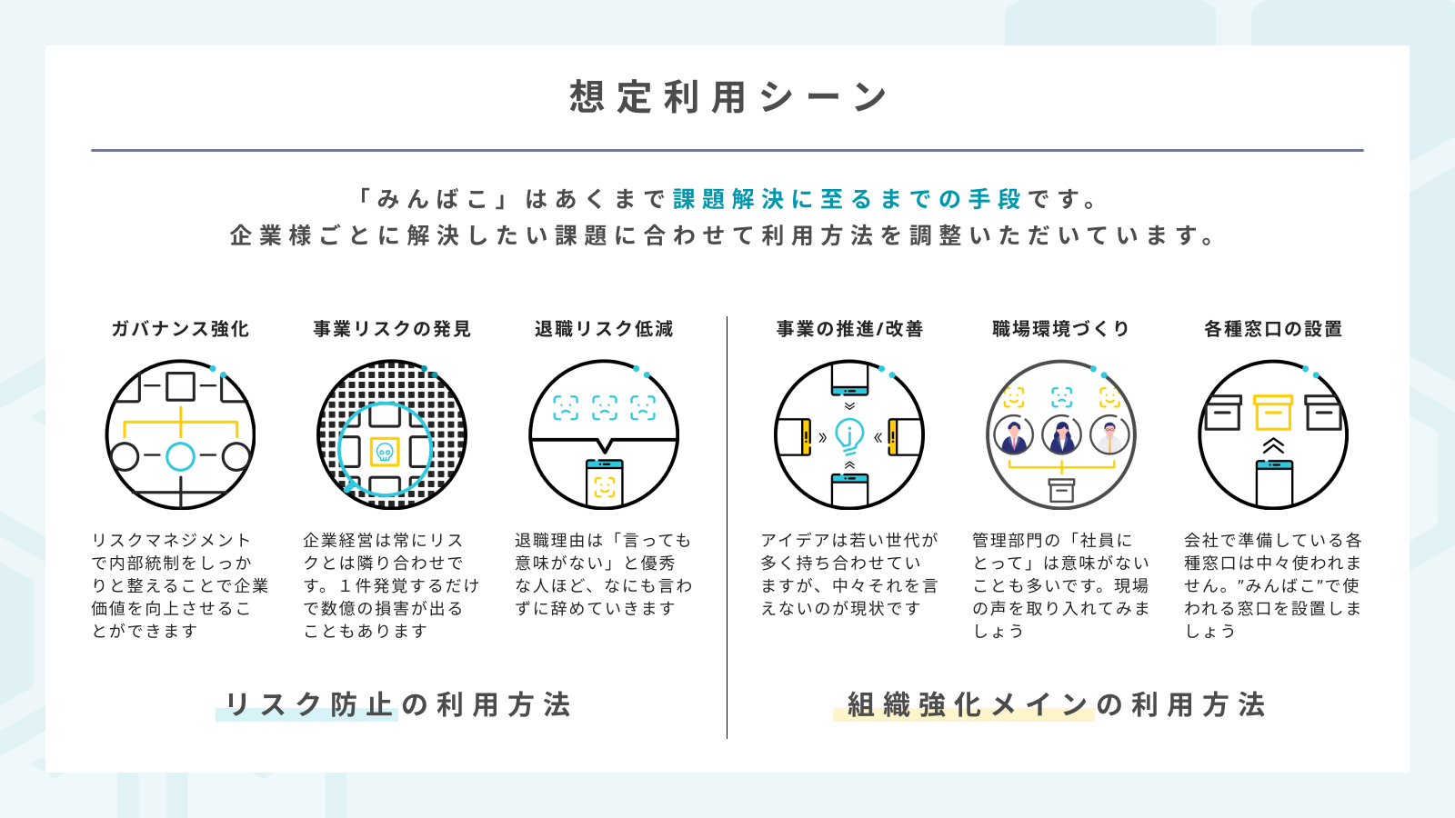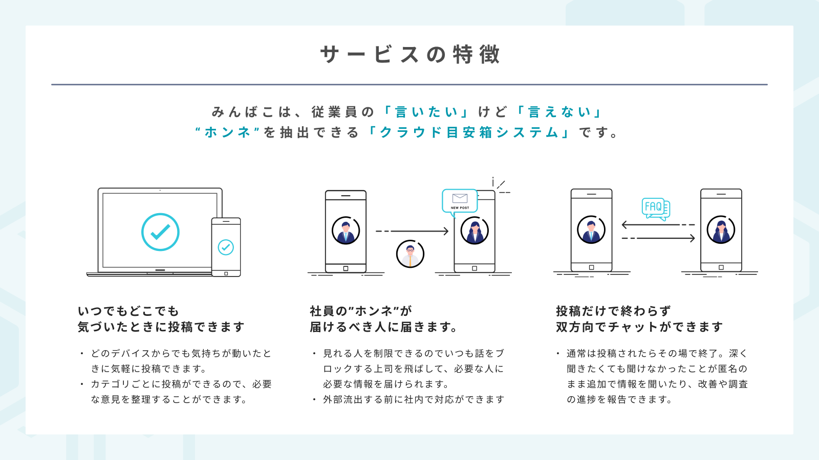 みんばこは、「“意見”から“ラベル”を切り離し本当に必要な声を届ける”」を掲げ、組織における「言えないことによる機会損失」という日本人特有の文化課題の解決をめざすベンチャー企業です。
