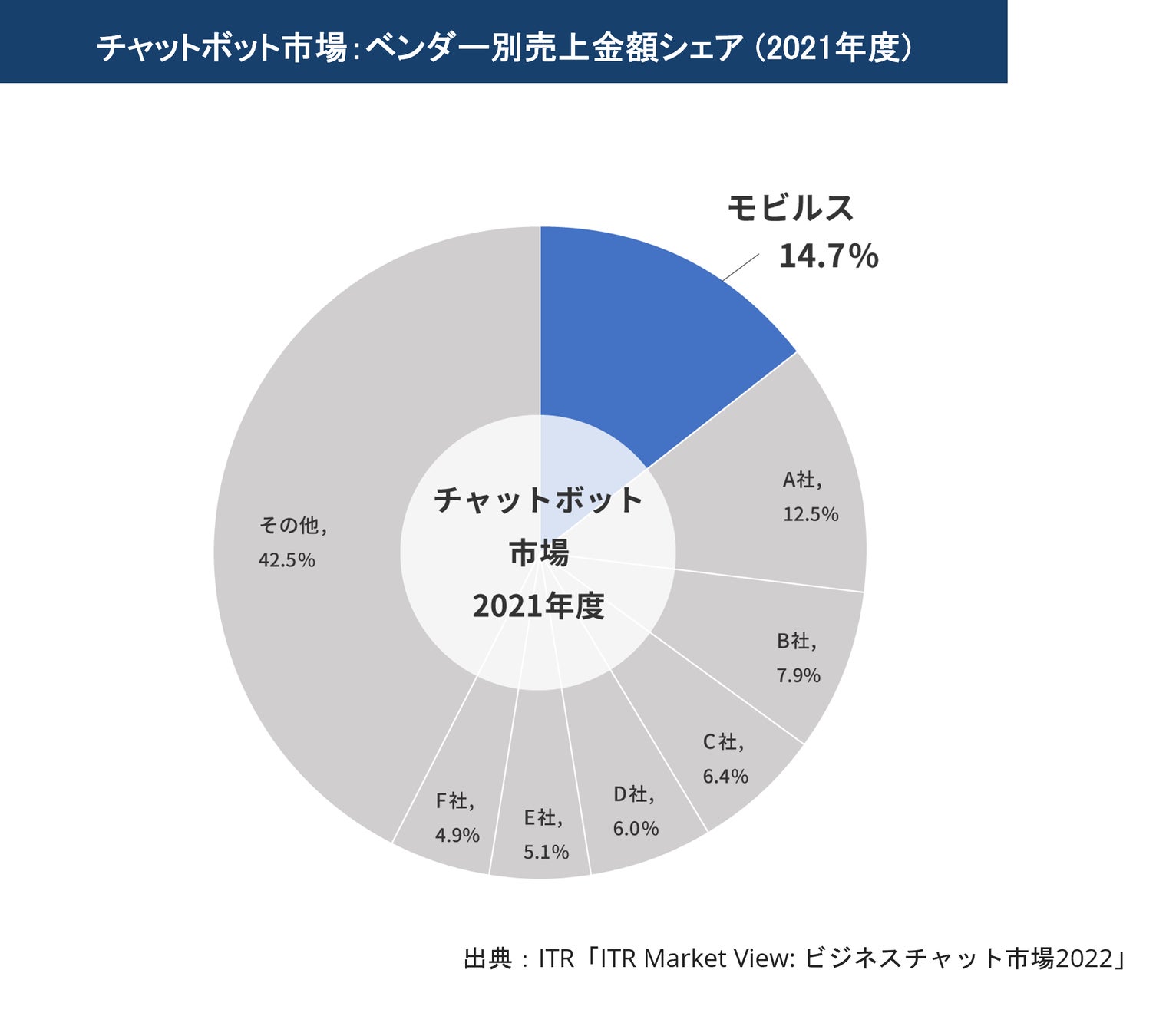 モビルスは、テクノロジーでサポートを新しくするThe SupportTech Companyです。企業のコンタクトセンターや自治体向けに、AIチャットボット(自動応答)と有人応答によるシームレスなチャットサポートを実現するチャットシステム「MOBI AGENT(モビエージェント)」や、チャットボット「MOBI BOT(モビボット)」、AI電話自答応答システム「MOBI VOICE(モビボイス)」、LINE公式アカウントに対応したセグメント情報配信システム「MOBI CAST(モビキャスト)」、問い合わせ導線を一元化しガイダンスとフローをビジュアル化する「Visual IVR」をはじめとした、カスタマーサポート支援のソリューション開発を行っています。モビシリーズは400社以上に導入実績があり(2022年2月時点)、5年連続でチャットボット市場売上シェア1位※を獲得しました。