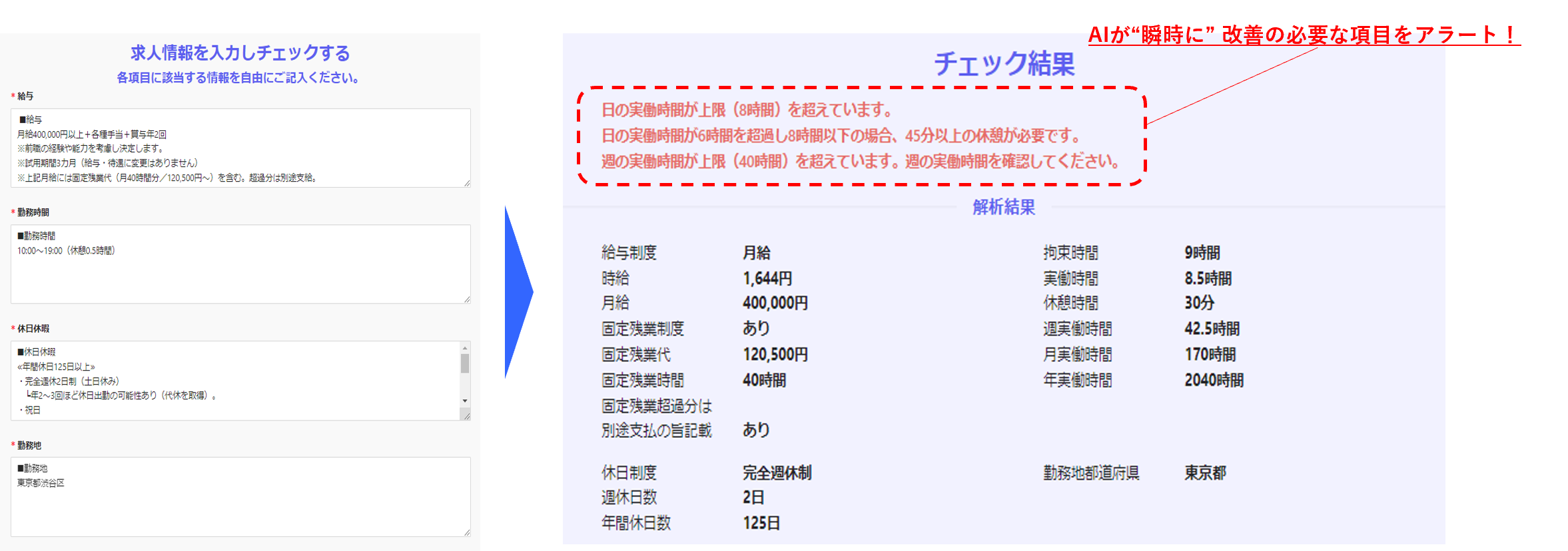 ▼「給与」「勤務時間」「休日休暇」「勤務地」を日本語で入力することで、当該求人広告が一般的な広告運用のルールに照らし合わせた適正なものになっているかを自動でチェックすることができます。