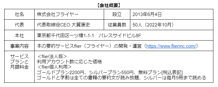 株式会社フライヤーは、本の要約サービス「flier(フライヤー)」を運営する、ITベンチャー(2013年6月設立)です。最大の特長は「書評(レビュー)」ではなく「要約」である点です。書き手の主観が入る書評とは異なり、著者の主張や論理(重要ポイントや全体像)を忠実にまとめ、読者に伝えます。書評でないため、出版社と著者から要約の許可を得る必要があり、要約した原稿にも目を通していただくことで、高品質なサービスを提供しています。
