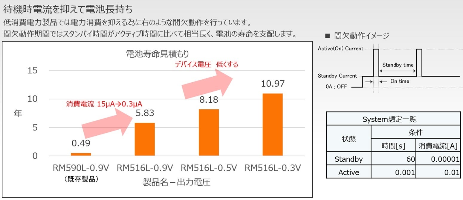「RM516/RM517シリーズ」は、VFM制御により待機時の無効電力を削減し、トータル消費電力を低減することで、電池の長寿命化や電池サイズの小型化に貢献します。