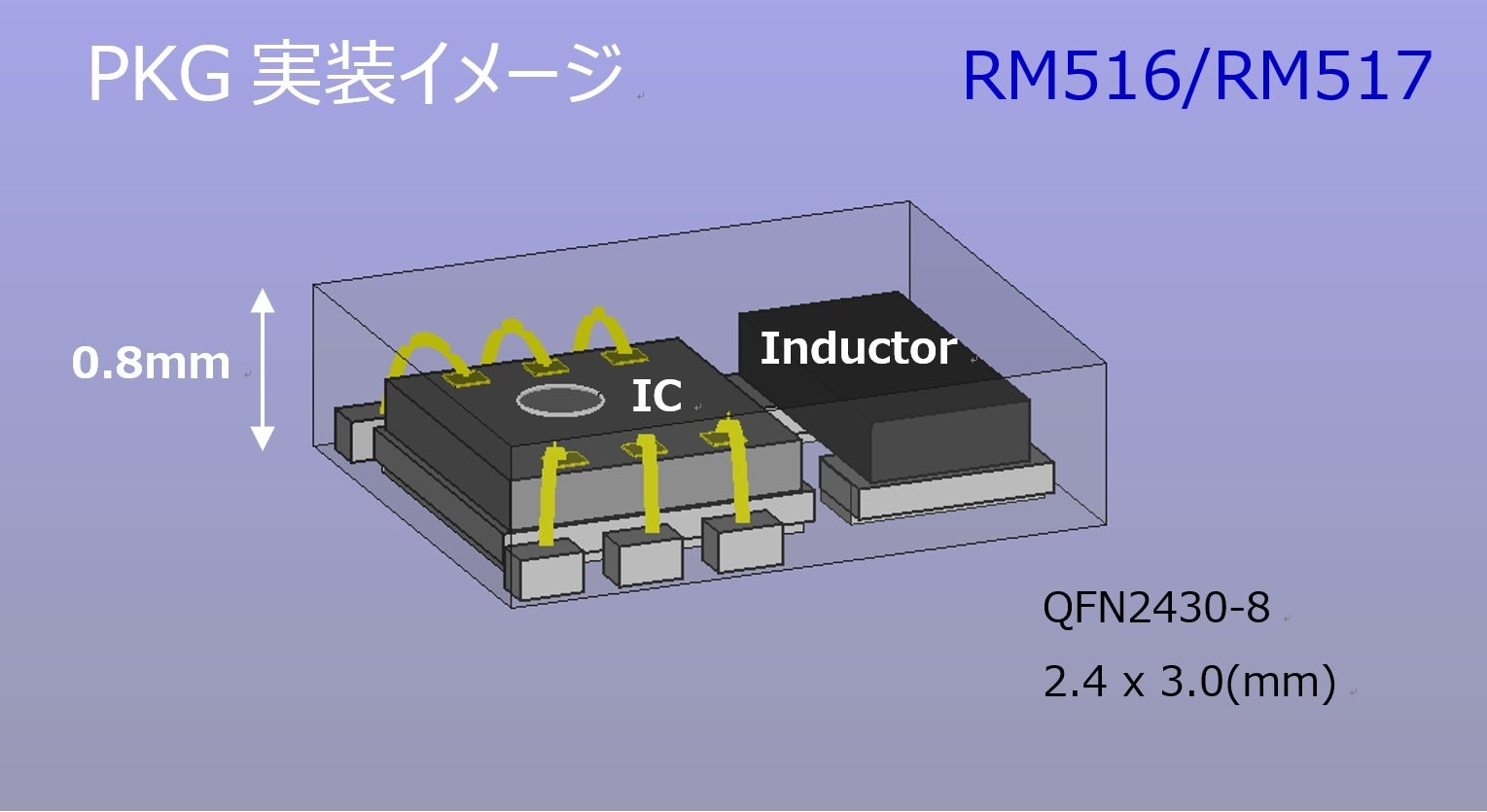 「RM516/RM517シリーズ」は、薄型インダクタを横に配置していることから、パッケージ高さ0.8(mm)という薄型化を実現し、高さ制限のある基板実装にも対応可能です。また、インダクタが内蔵されているため、入出力コンデンサをチップ近傍に任意に配置するだけで、基板設計が簡単にでき、インダクタ選定の手間とEOLの心配を減らすことでお客様の困りごとの解決に貢献いたします。